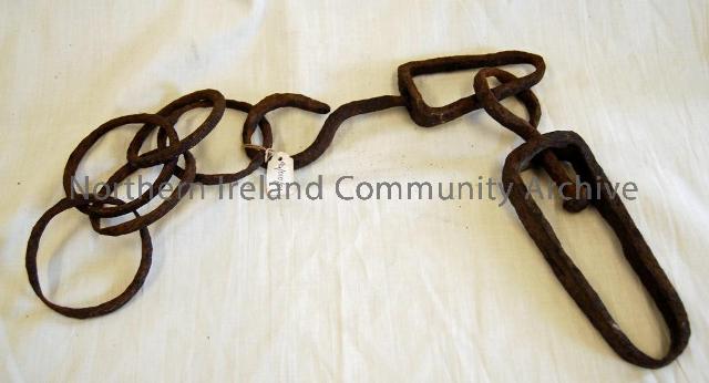 chain with metal holder link attached at end. Possibly used to hang pots/kettles over a fire. Courtesy of Ballycastle Museum.
