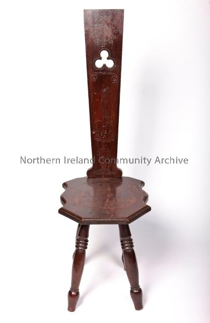 straight back spinning chair - has a drilled shamrock design on the back and Celtic designs in poker work. Courtesy of Ballycastle Museum.