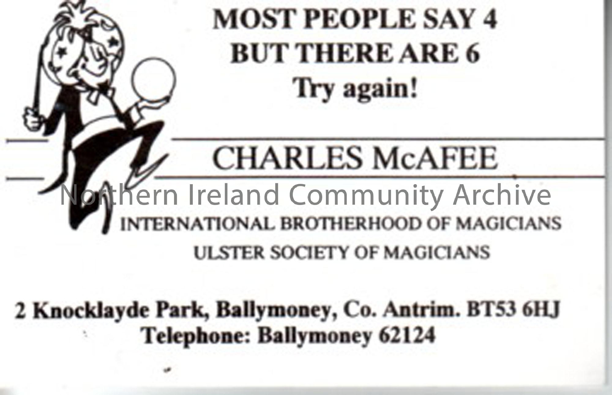 Charlie McAfee, International Brotherhood of Magicians Ulster Society of Magicians buisness card