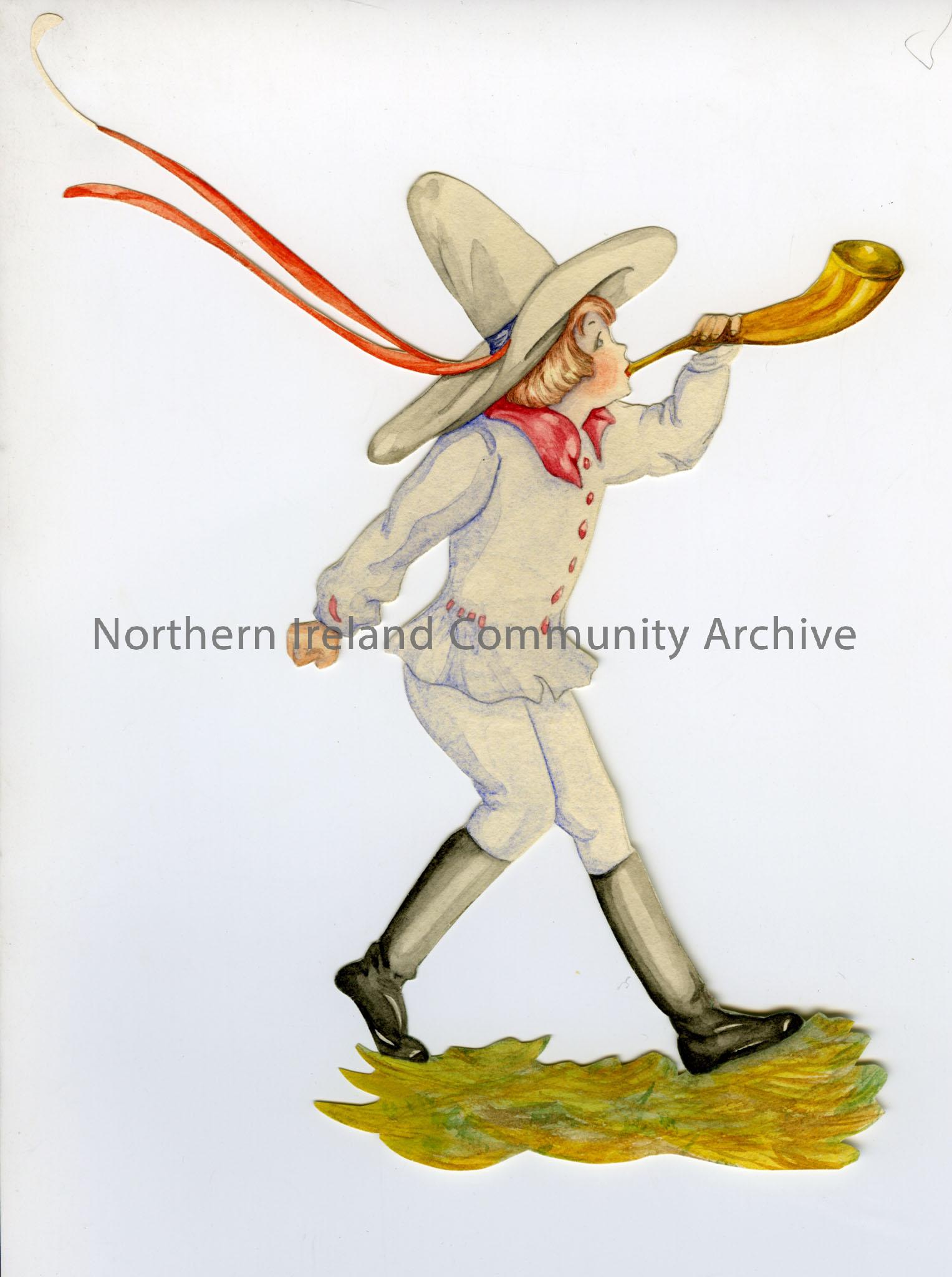 watercolour figure of child playing golden horn. The young girl wears a hat with orange ribbons trailing behind her. The figure has been cut out, attributed to Gertrude Trimble