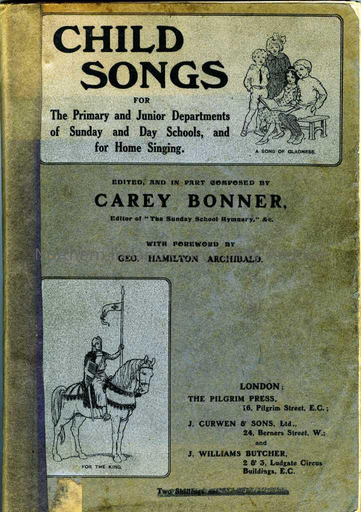 Child Songs Volume II- for the Primary and Junior Departments of Sunday and Day Schools and for Home Singing. Several handwritten pages joined by pin, which is rusting, affixed to inside of front cover - relate to Sabbath School Competition 9th November 1919. Extra songs affixed to inside of back cover