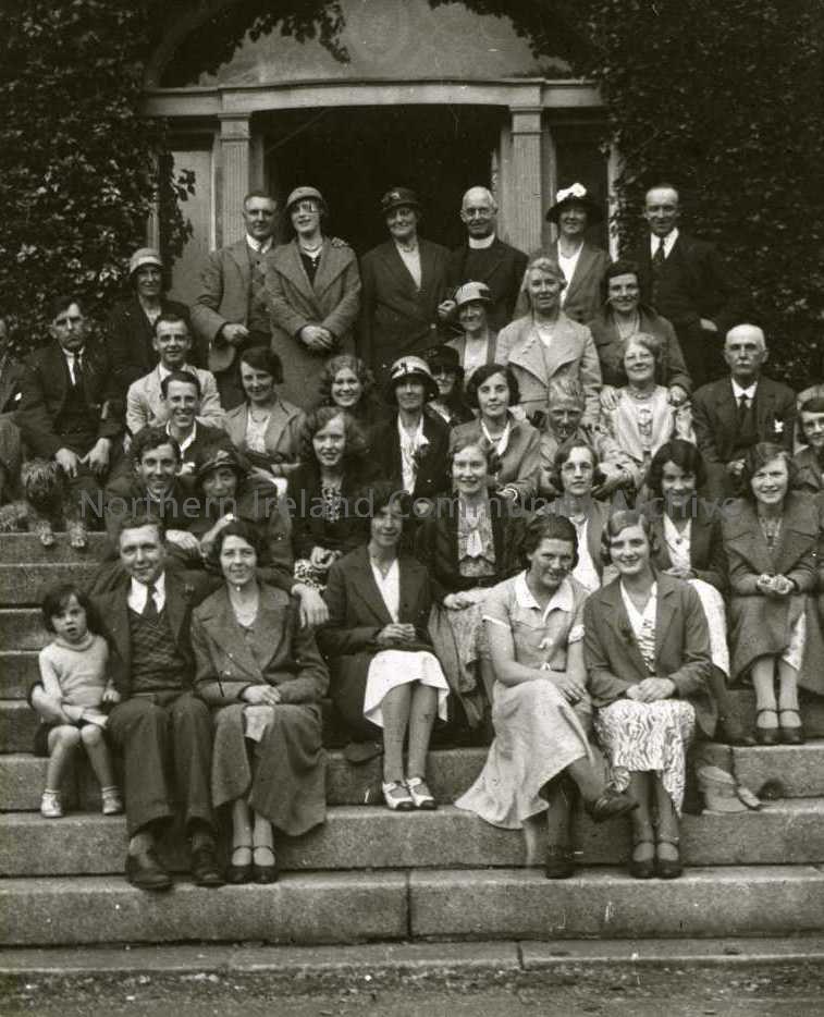 Group of people (choir) standing on entrance steps to building - Comber. (JM - Cumber/Claudy parish. Probably 1st Coleraine Choir, ? in 1920s. SH was an elder. Mrs Henry back row to right of minister)