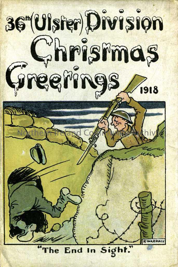 Christmas card - 36th (Ulster) Division Christmas Greetings, 1918. "The end in sight" Cartoon on front by R.Warrall. Signed inside from Jim.