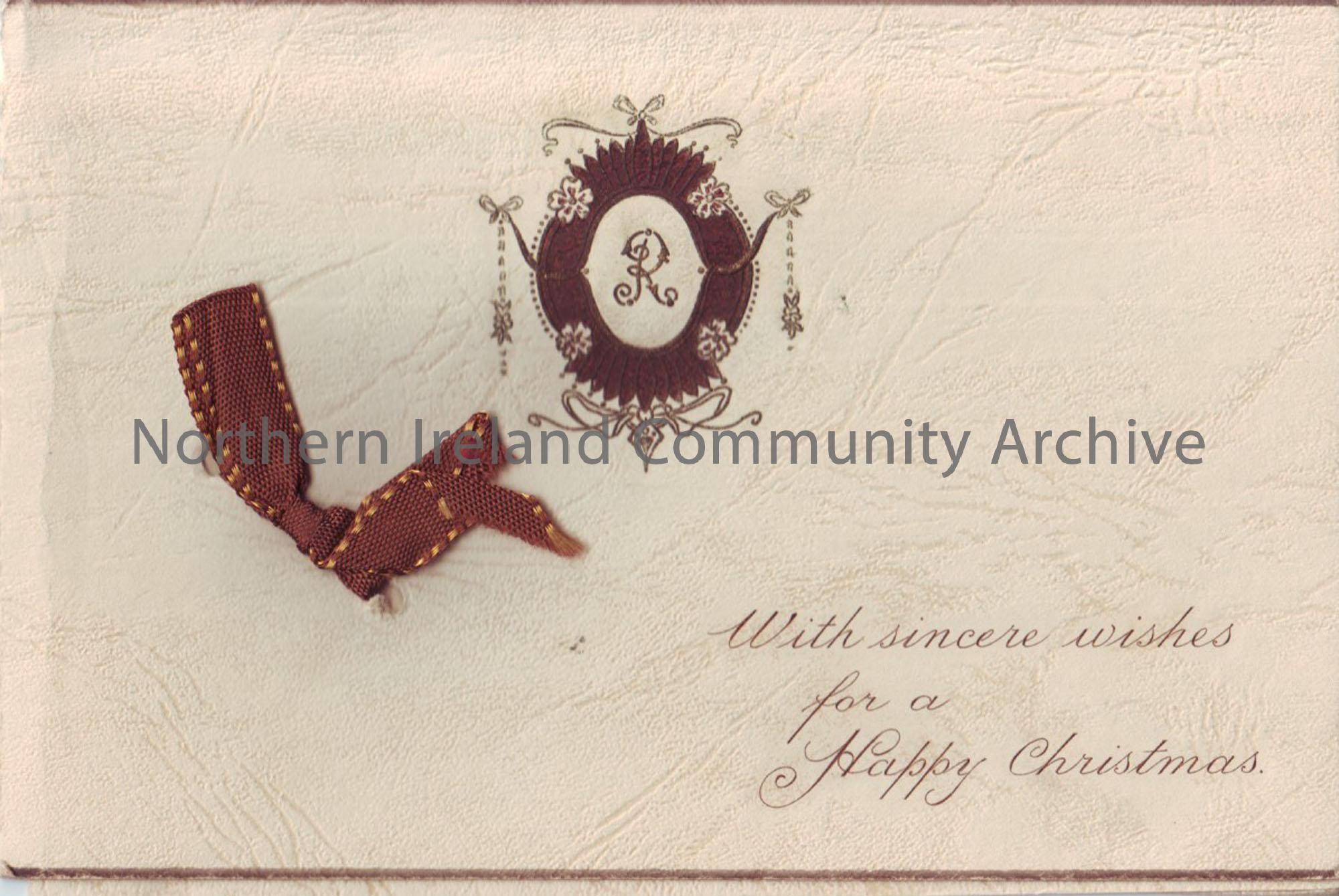 Christmas card, emblem with ‘R’ on front and verse inside. From Robert McLean, Market Street, Ballymoney, 1936