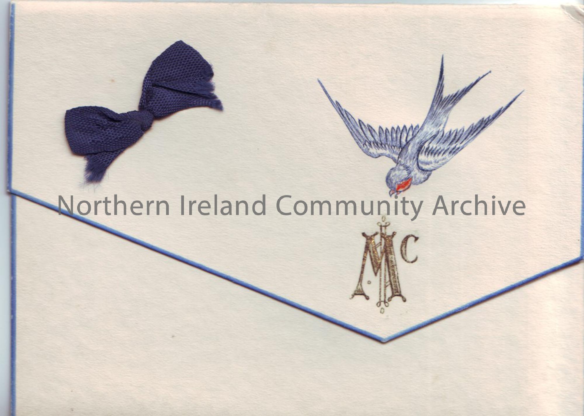 Christmas card, with verse inside. Initialled ‘Mc’ on front and blue bird. From Mr and Mrs F. J. McLoughlin, 6 Market Road, Ballymena, 1934.