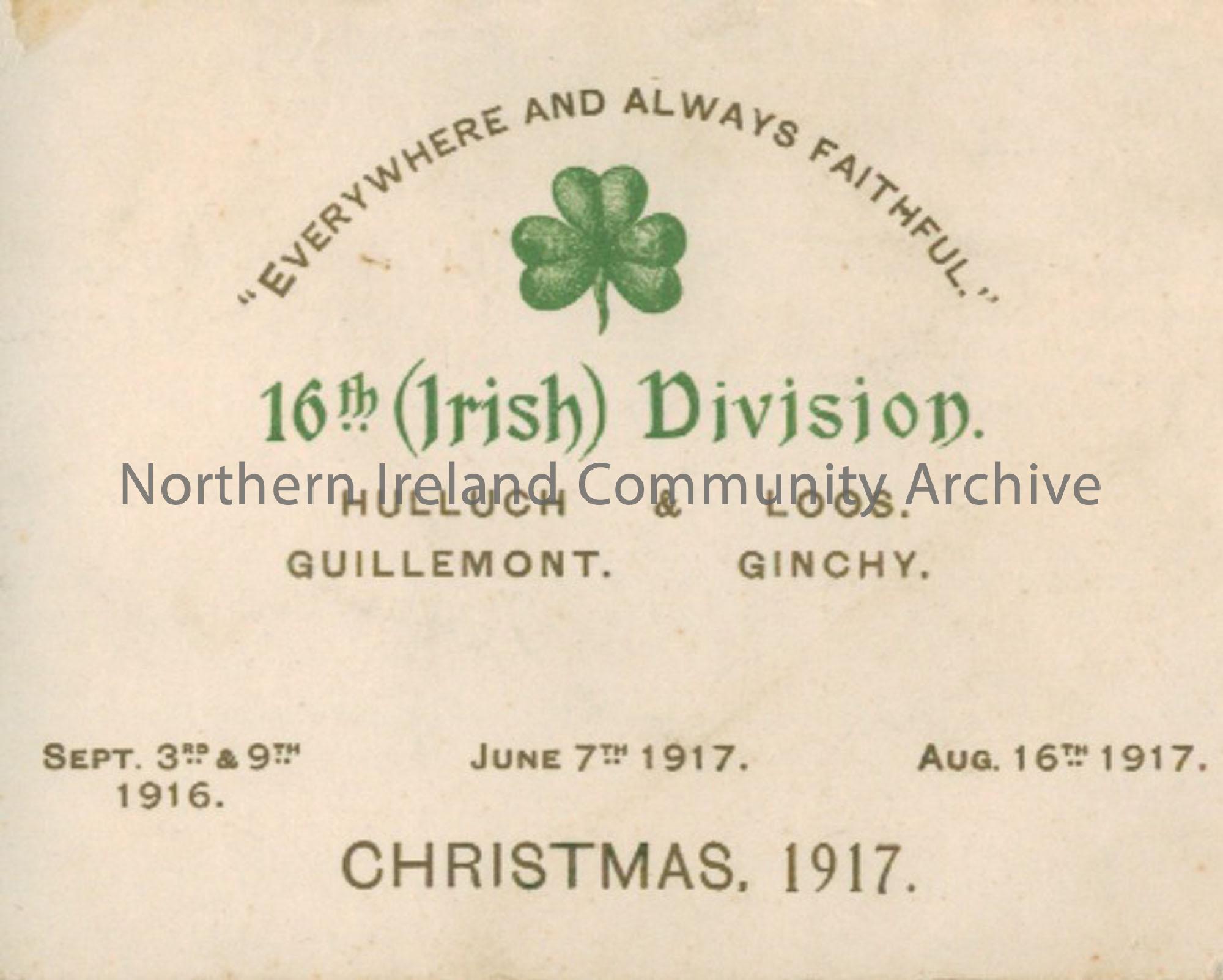 Christmas card, World War One. From the 16th (Irish) Division, Christmas 1917. Shamrock on front, with cartoons inside
