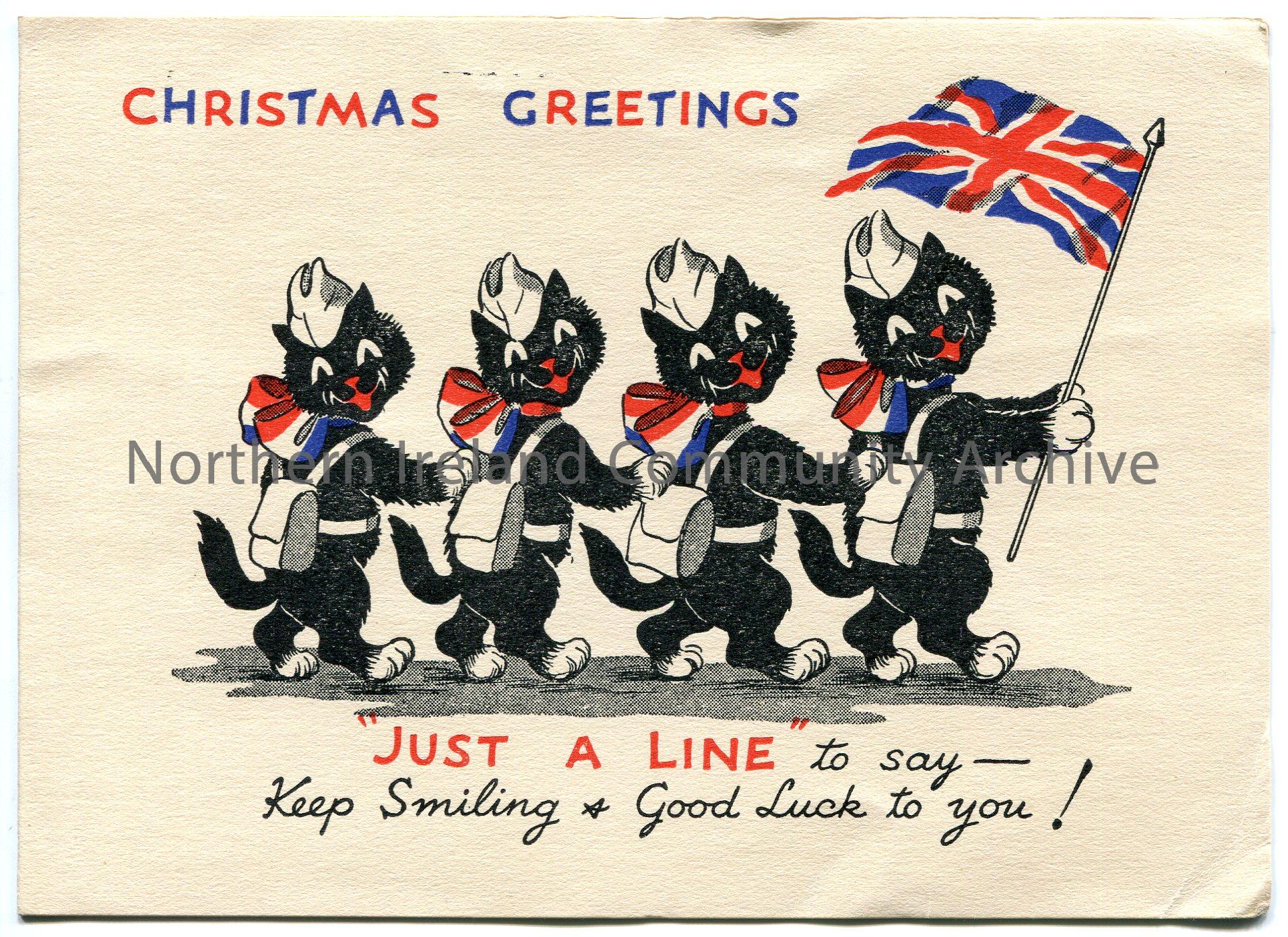Christmas greetings card. Features four cats in a line, one of which is at the front holding a Union Jack flag. Printed on the front is 'Just a Line to say - Keep Smiling & Good Luck to you!'. From Susan, Arthur and Patricia. Addressed from 12 Dahey Road, Singapore.