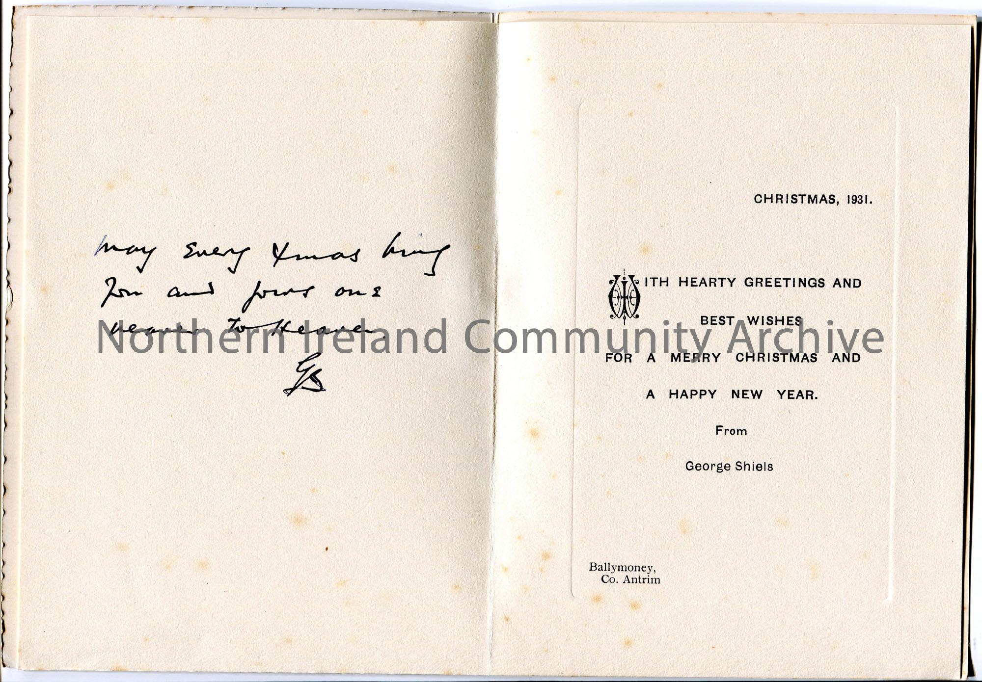 Christmas greetings card to Sam Henry from George Shiels. Dated Christmas 1931. Christmas scene on front, in colour with green bow on left side. Front cover reads 'Every Good Wish'. Inside is a handwritten message 'May Every Xmas bring you and yours one nearer to Heaven. G.S'.