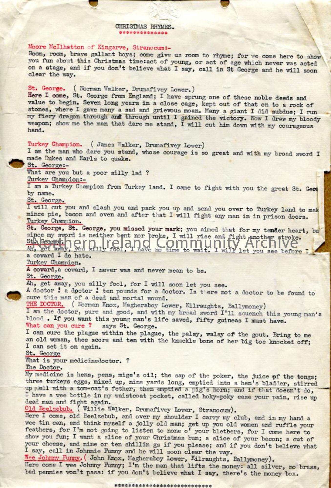 Typed notes under heading 'Christmas Rhymes'. Information donated by various people (named) - verses, 2 short scripts about St George.