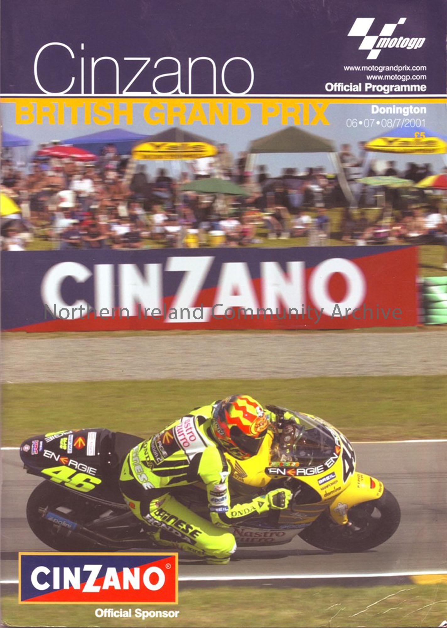 Cinzano British Grand Prix official programme. Includes lists of Entrants in each class and lap score charts. August 2001