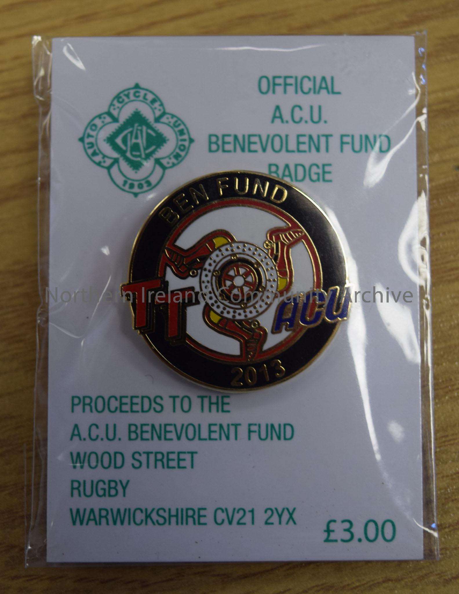 Circular A.C.U. Benevolent Fund pin badge with red and gold image of the Isle of Man's three legged man in a white circle with black ring around the edge and TT ACU on either side. Still in plastic wrapping.