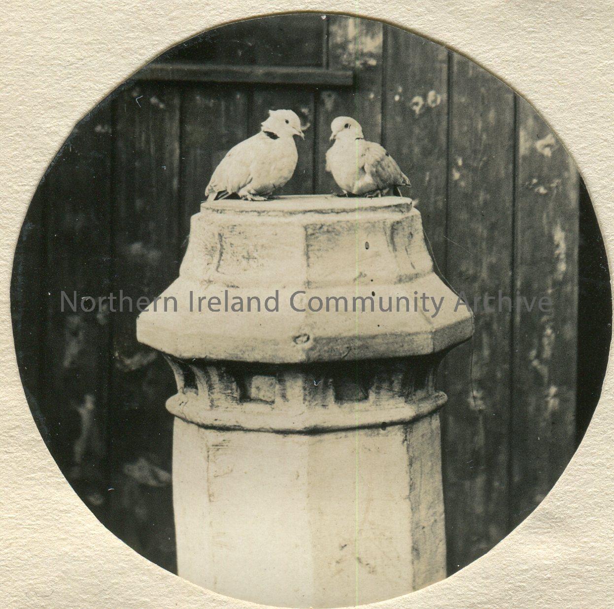 Circular, black and white photograph of two birds sitting on top of a stone sculpture.