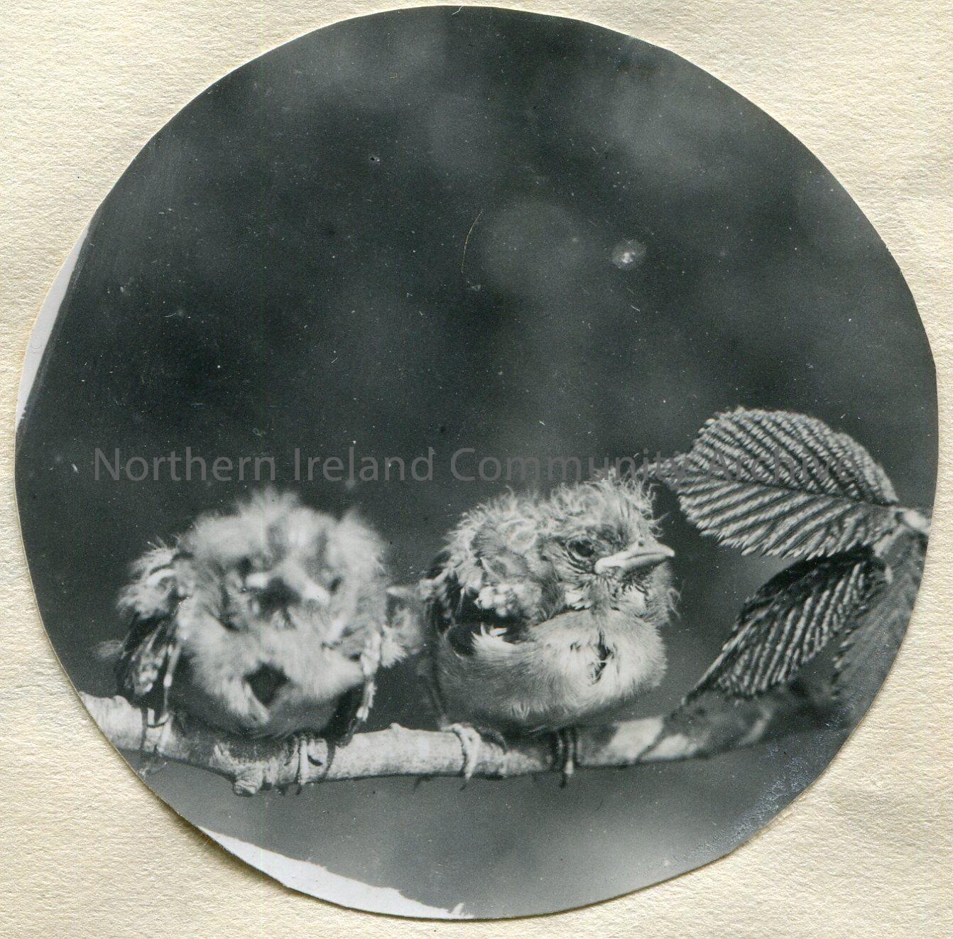 Circular, black and white photographic image of two small birds sitting side by side on a branch of a tree.