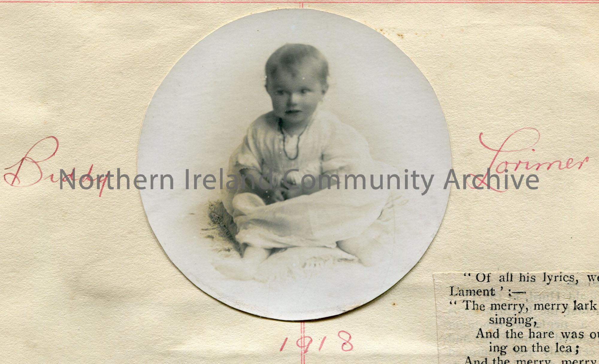 Circular photograph of a small child called Biddy Lorimer, possibly around 1 years. Dated 1918.