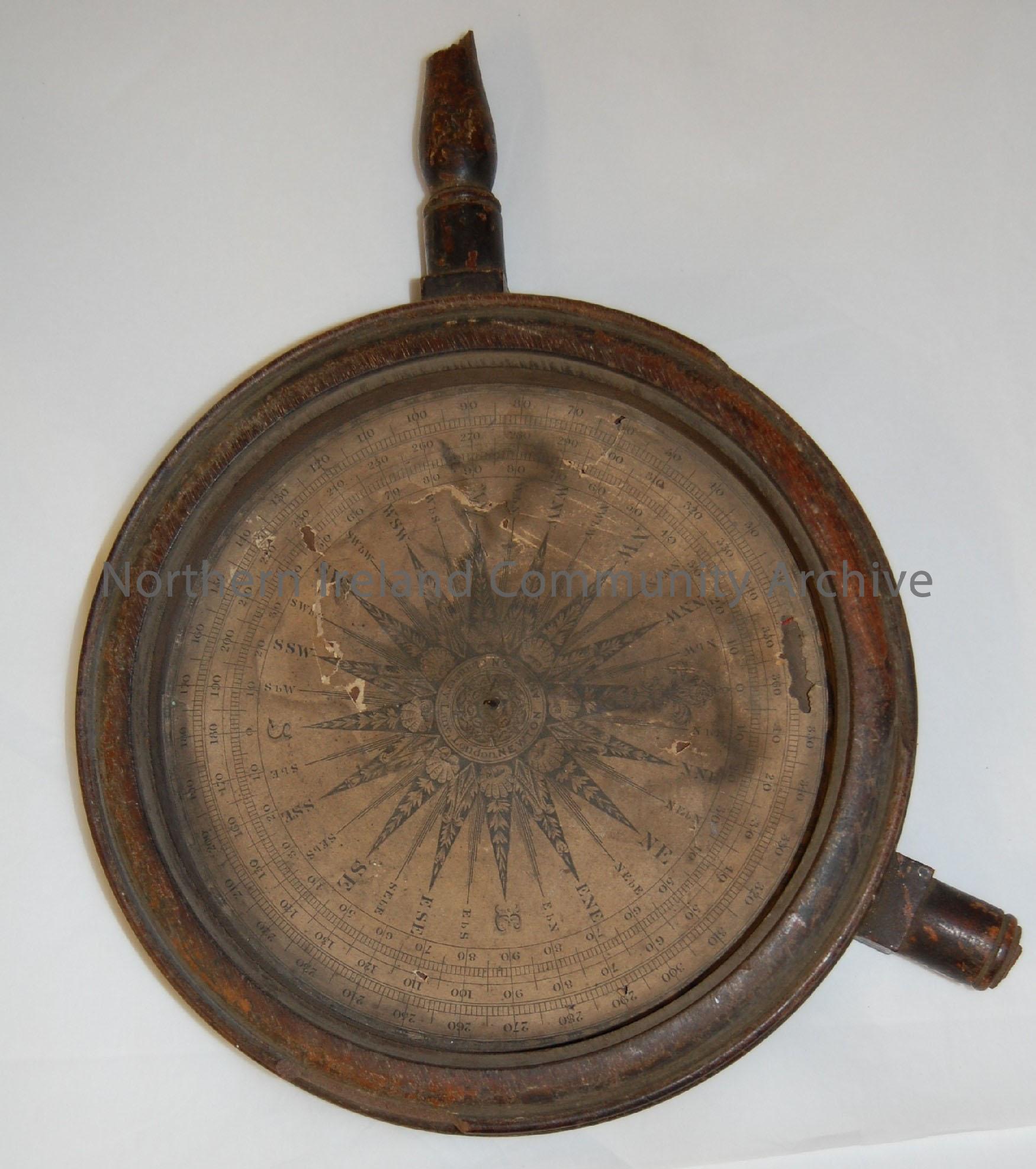 circumferentor. Wooden circle with printed circular insert glued to it and a pin positioned at the centre of the circle.There are two turned wooden ar… – 1992.274 (2)
