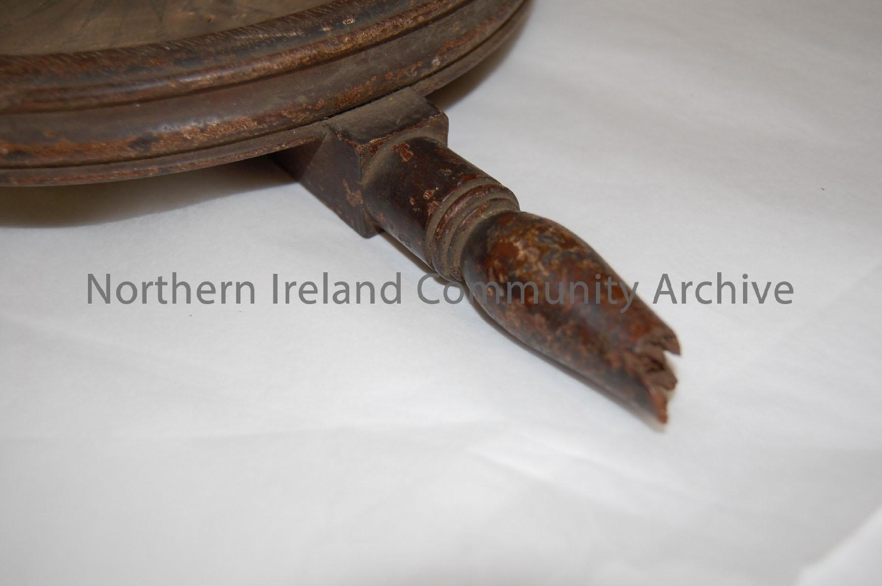 circumferentor. Wooden circle with printed circular insert glued to it and a pin positioned at the centre of the circle.There are two turned wooden ar… – 1992.274 (3)
