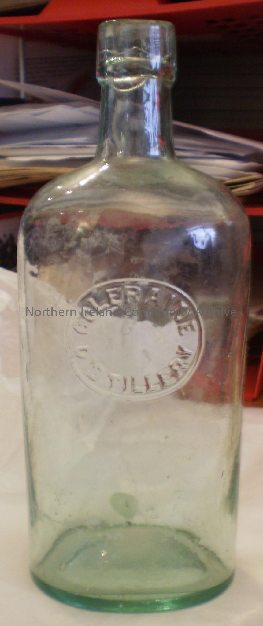 Clear glass bottle with ‘Coleraine Distillery’ imprinted on the glass.