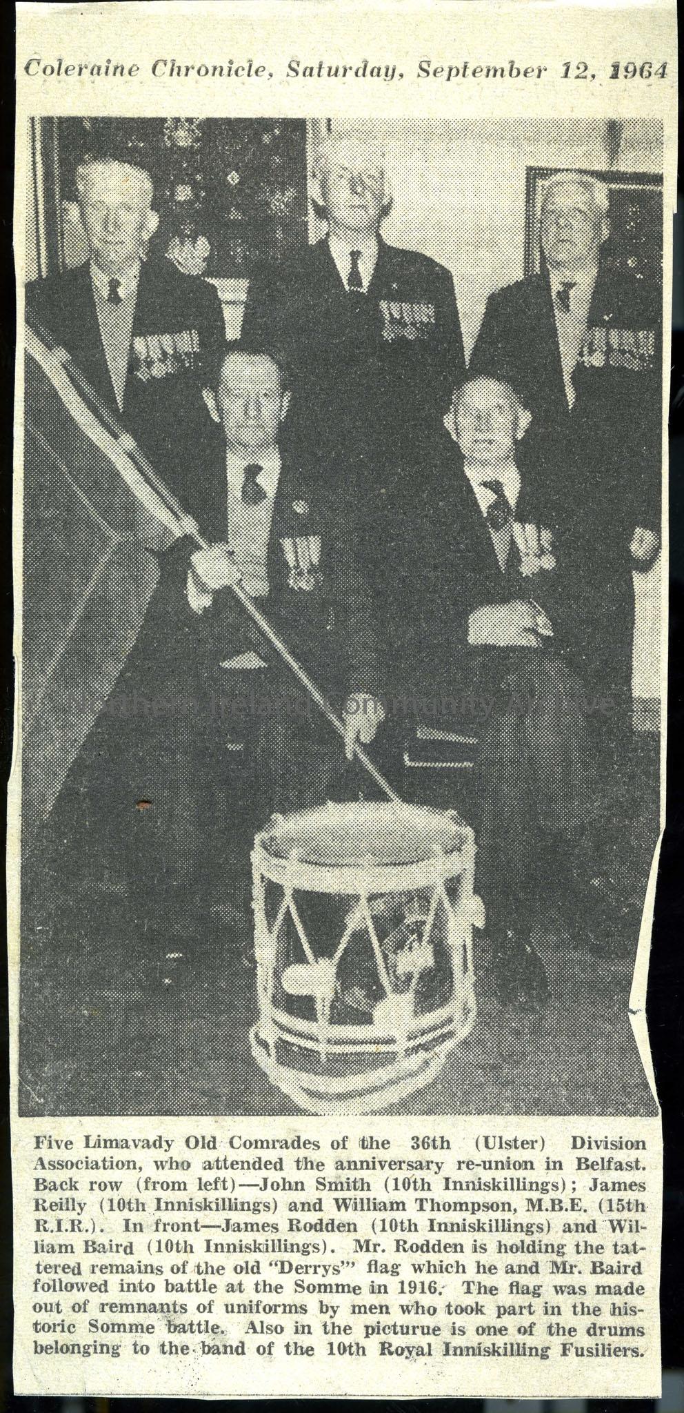 Clipping from Coleraine Chronicle newspaper, dated Saturday, September 12, 1964. Contains photograph of 5 members of Limavady Old Comrades of the 36th…