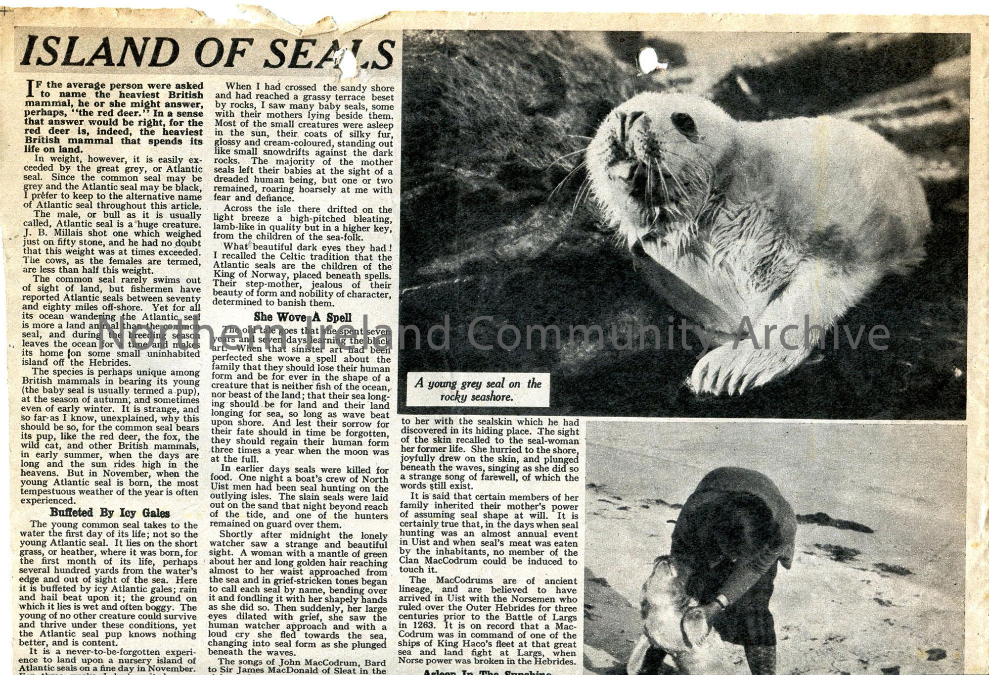 Clipping from published item, entitled ‘Island of Seals’ – printed article with photos about seals on the Hebrides