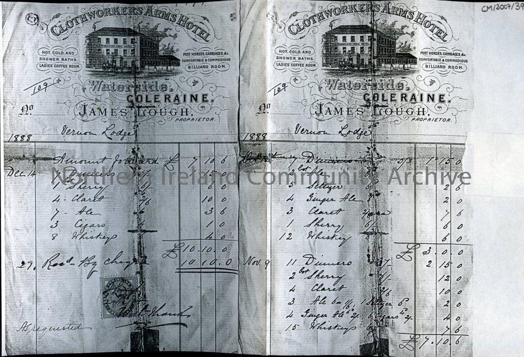 Clothworkers Arms Hotel, Waterside Coleraine (photocopied invoice dated 1888)