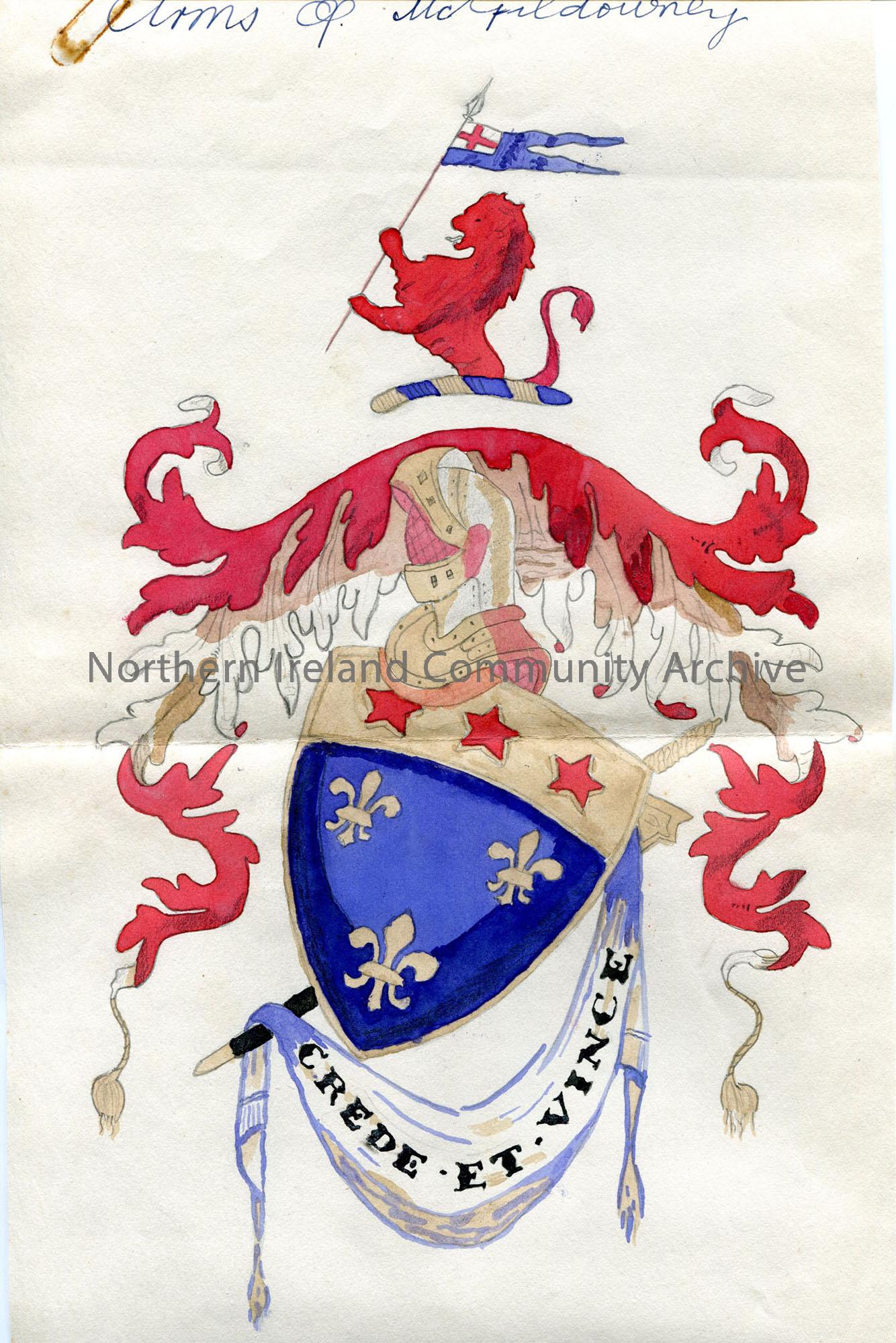 Coat of Arms of McGildowney family – similar but not identical to other versions. Motto ‘Crede et Vince’ [Believe and Conquer].
