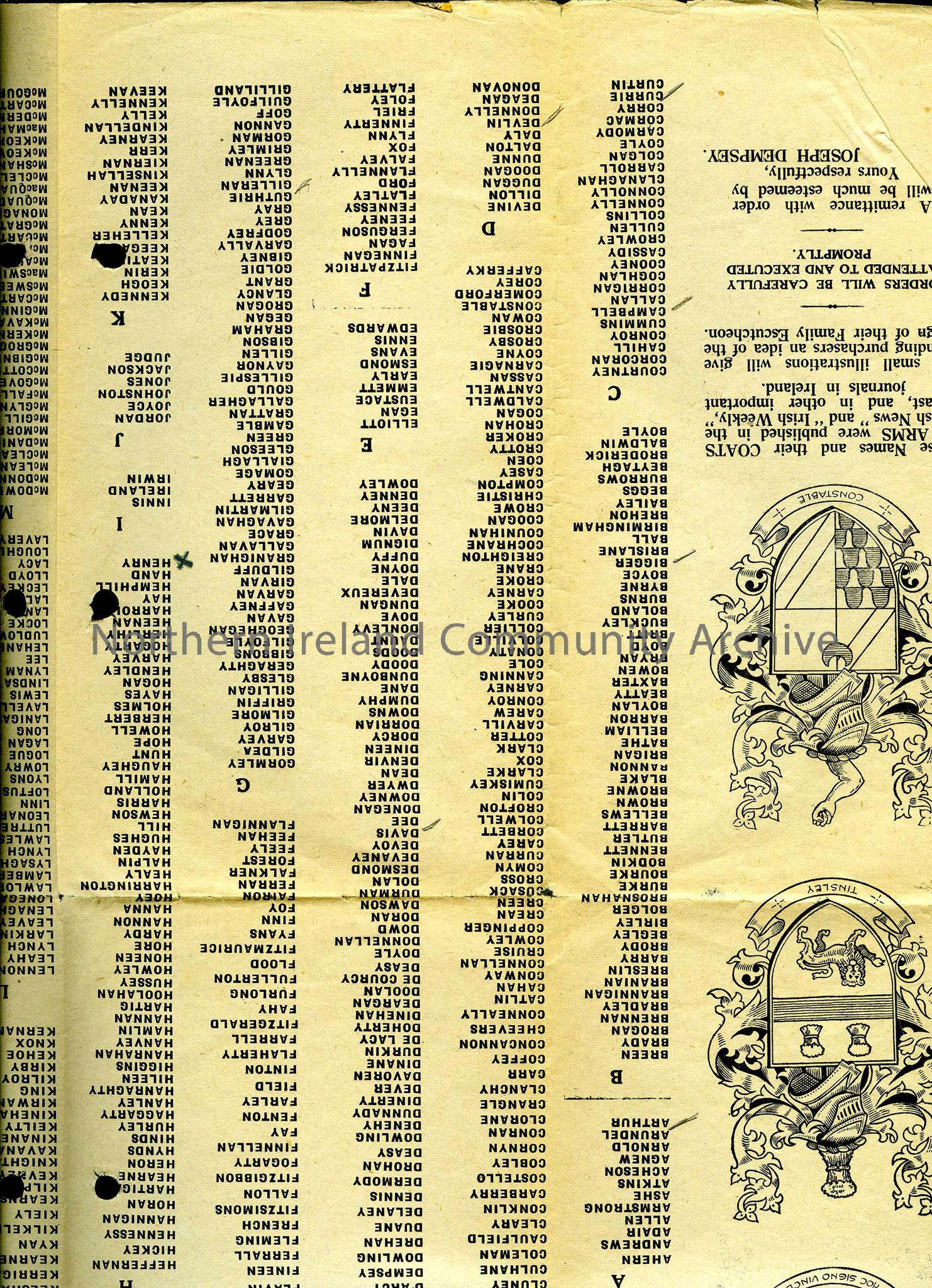 A poster with Coat of Arms of Irish Families - mostly a list of names with a few examples of coat of arms round the border. Sam Henry has marked occasional names, including his own. Paragraph on left bottom corner says the poster was printed in The Irish News and Irsih Weekly, as an illustration for those wishing to purchase their family coat of arms. This is probably and advertisement then.