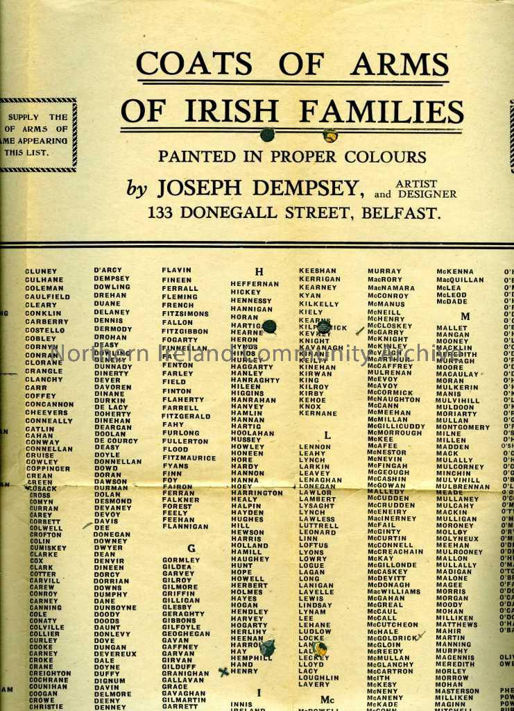 A poster with Coat of Arms of Irish Families - mostly a list of names with a few examples of coat of arms round the border. Sam Henry has marked occasional names, including his own. Paragraph on left bottom corner says the poster was printed in The Irish News and Irsih Weekly, as an illustration for those wishing to purchase their family coat of arms. This is probably and advertisement then.