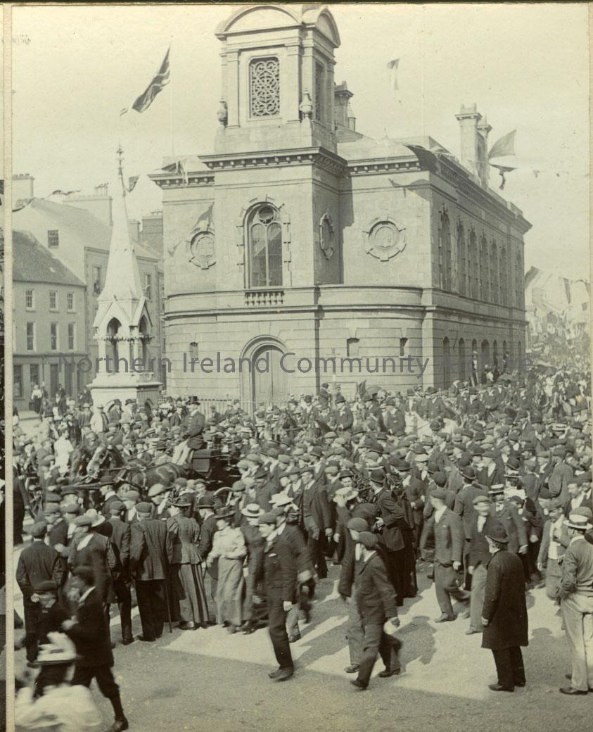 black and white image depicting the Coleraine Diamond and Coleraine Town Hall, with crowd scene and flags. Selection of age groups present including, boys, girls, and adults. All in Victorian dress, many wearing hats. There are two images on one card, both are of the same view but seem to have been taken moments apart. These images were produced like this to be viewed with a stereo scope.