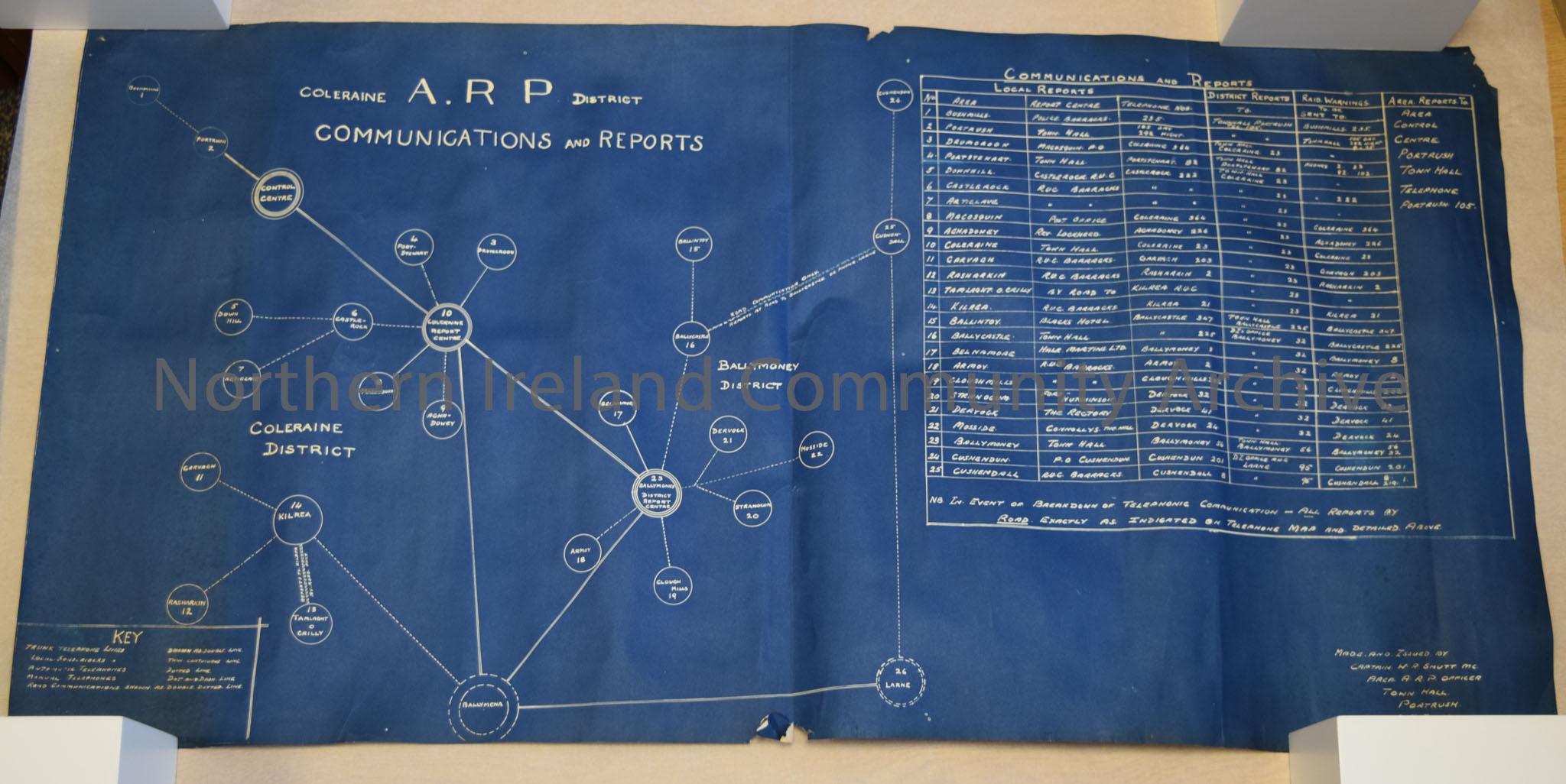 Coleraine A.R.P. District Communications and Reports. Blue and white document mounted and in black frame.