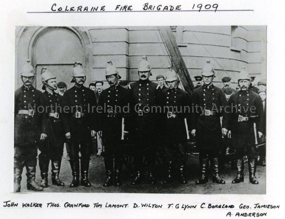 Coleraine Fire Brigade, 1909; John Walker, Thos. Crawford, Tom Lamont, D. Wilton, T.G. Lynn, C. Boreland, Geo. Jamieson and A. Anderson
