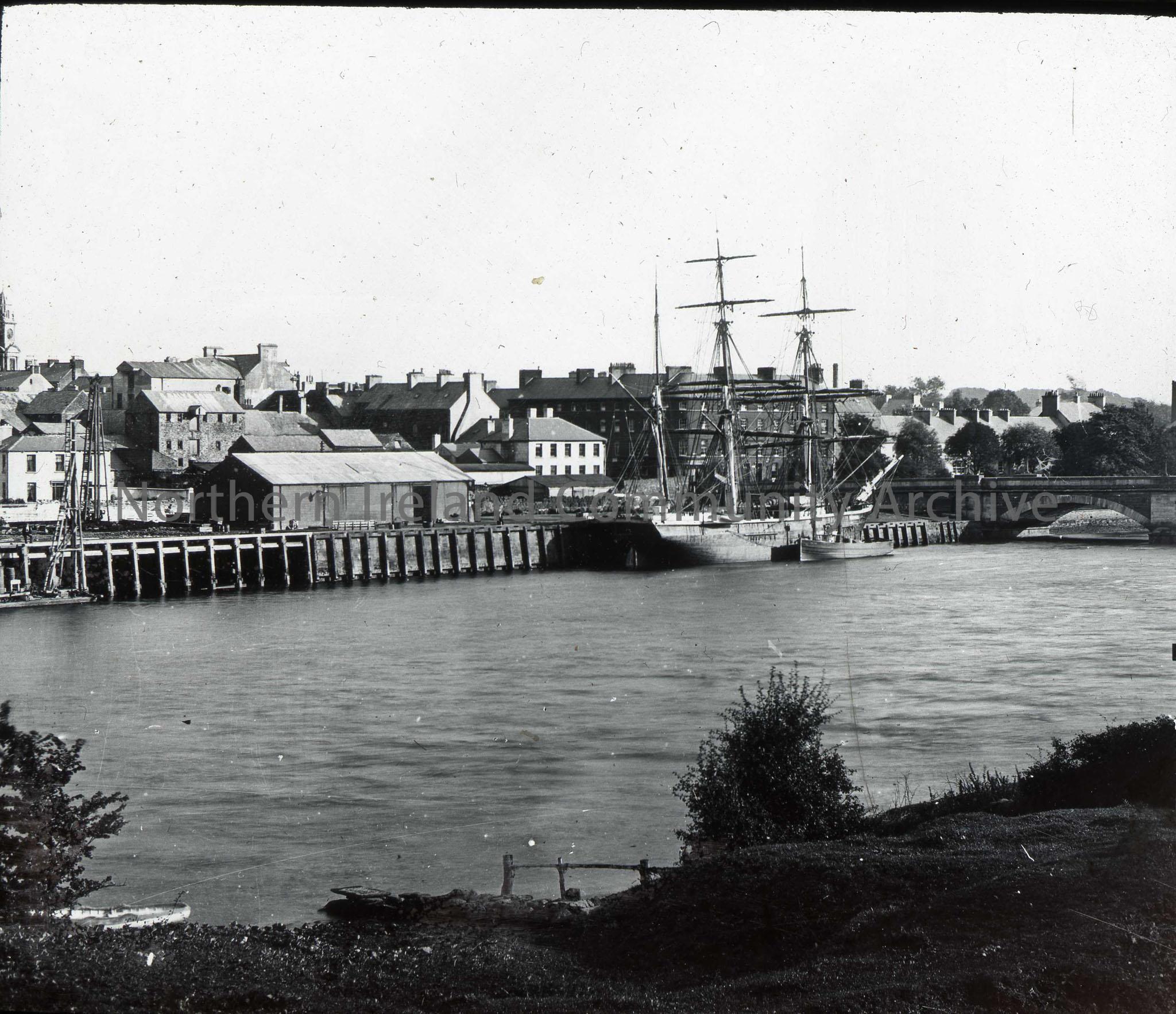 View of sailing ship at Coleraine Harbour, Bridge Street and Hanover Place in background, taken from opposite riverbank