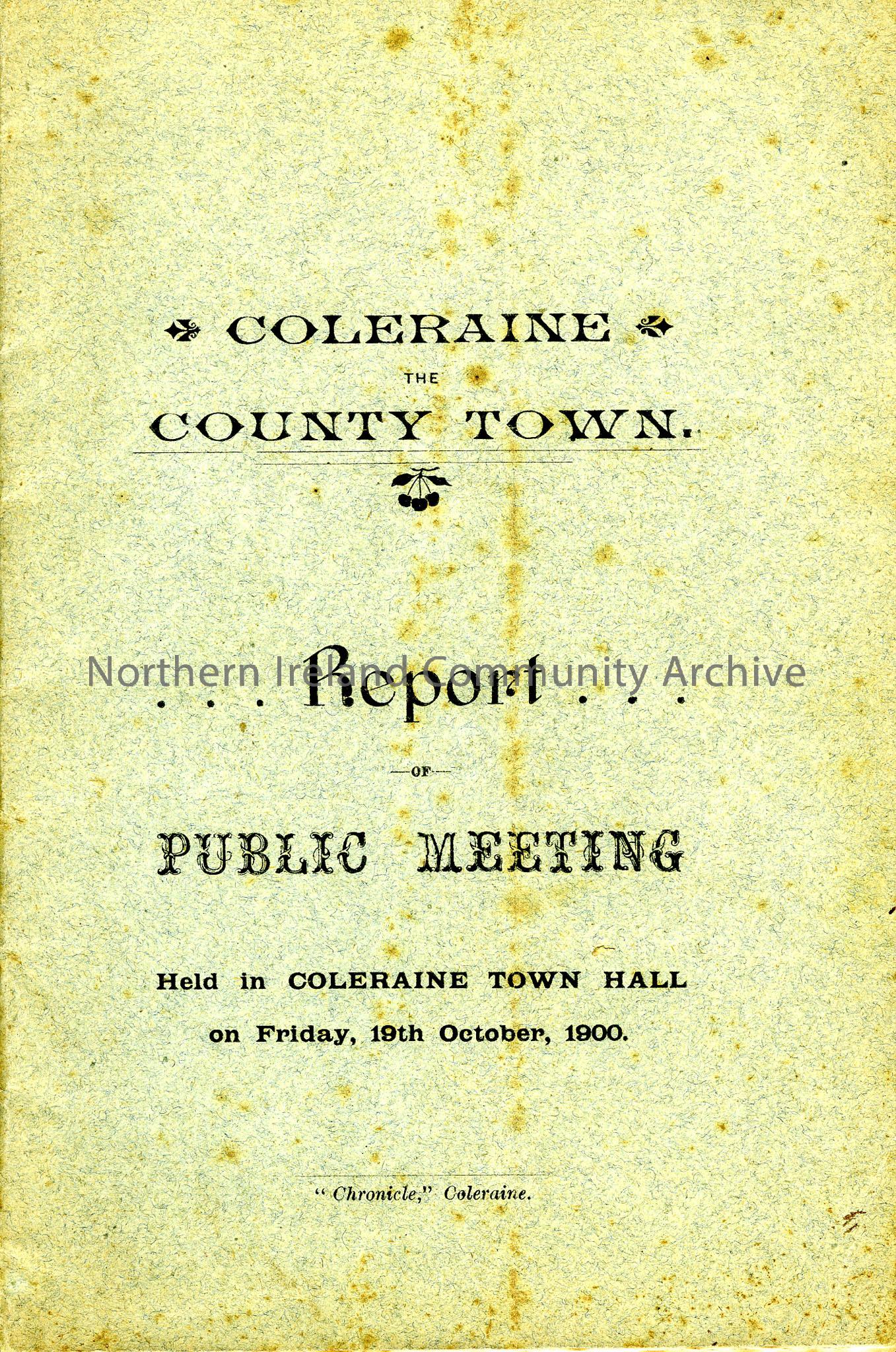 booklet detailing the happenings of a public meeting held in Coleraine Town Hall on Friday the 19th of October 1900.