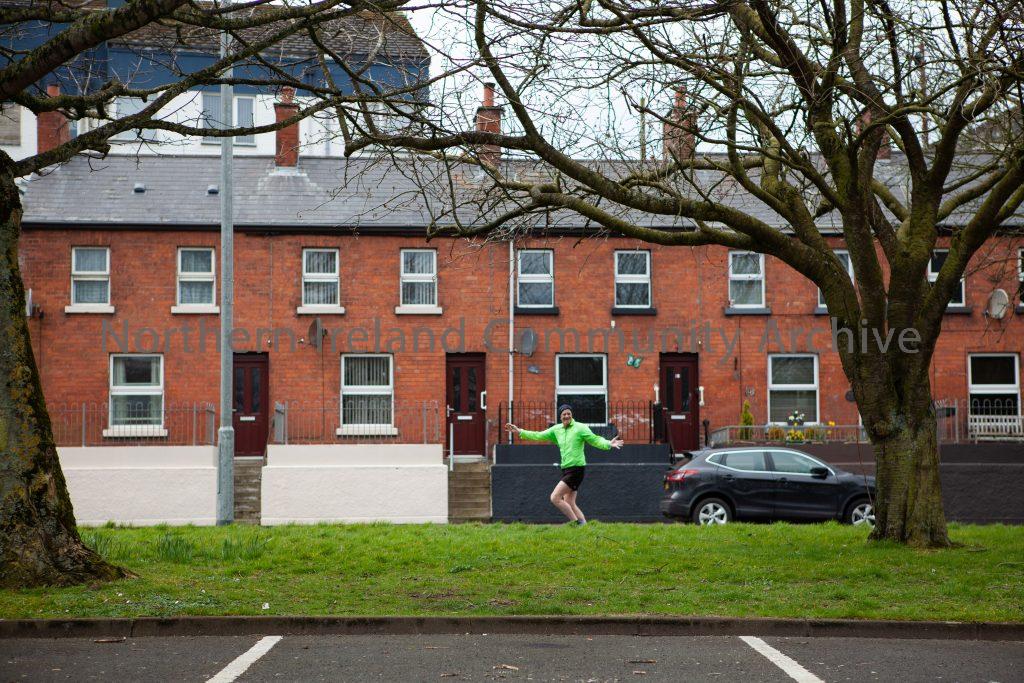 A jogger poses as he passes by along Strand Road in Coleraine on 20th March 2020 on the first day of imposed social distancing measures announced by the Government, in an attempt to control the spread of Covid-19 throughout the population.