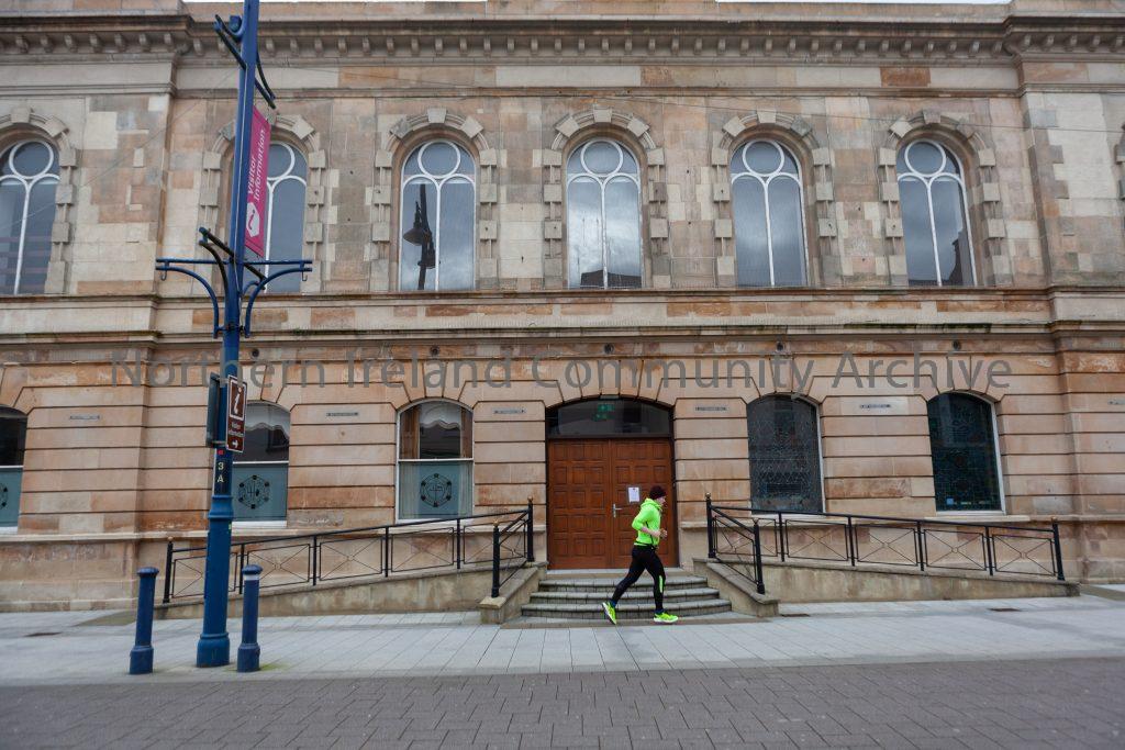 A jogger passes through a quiet town centre in Coleraine on 20th March 2020 on the first day of imposed social distancing measures announced by the Government, in an attempt to control the spread of Covid-19 throughout the population.