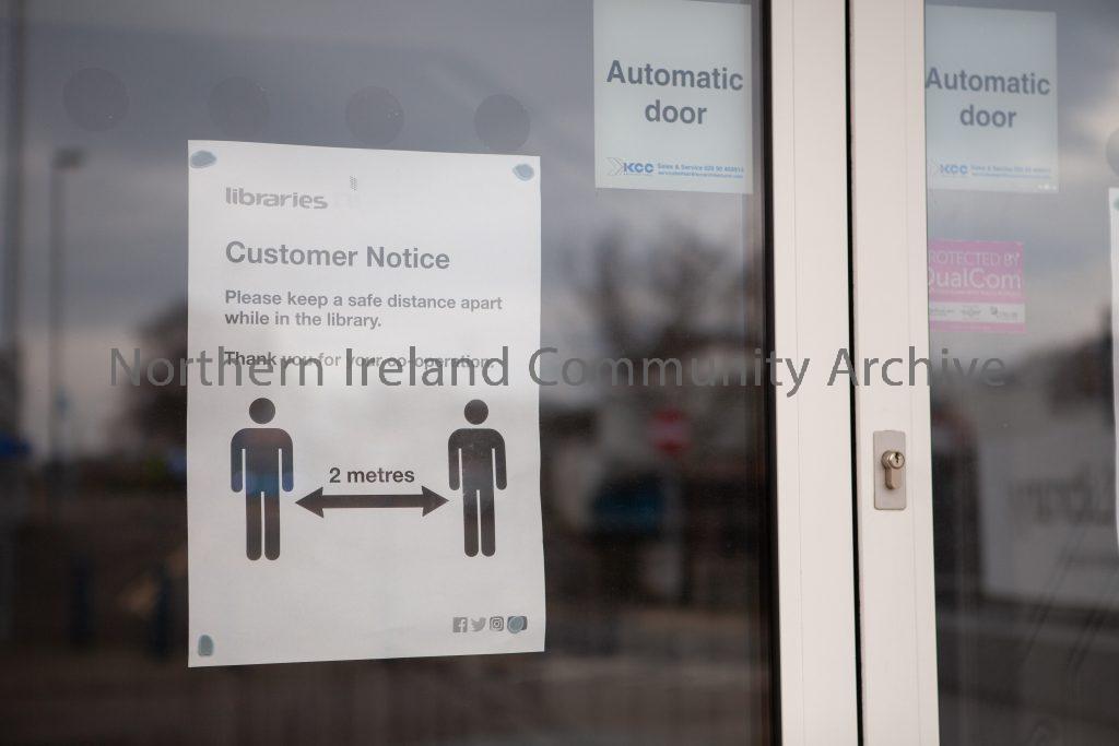 A sign on the door of the closed public Library on Queen Street in Coleraine, reminds customers to stay the government recommended 6 feet apart during their visit.