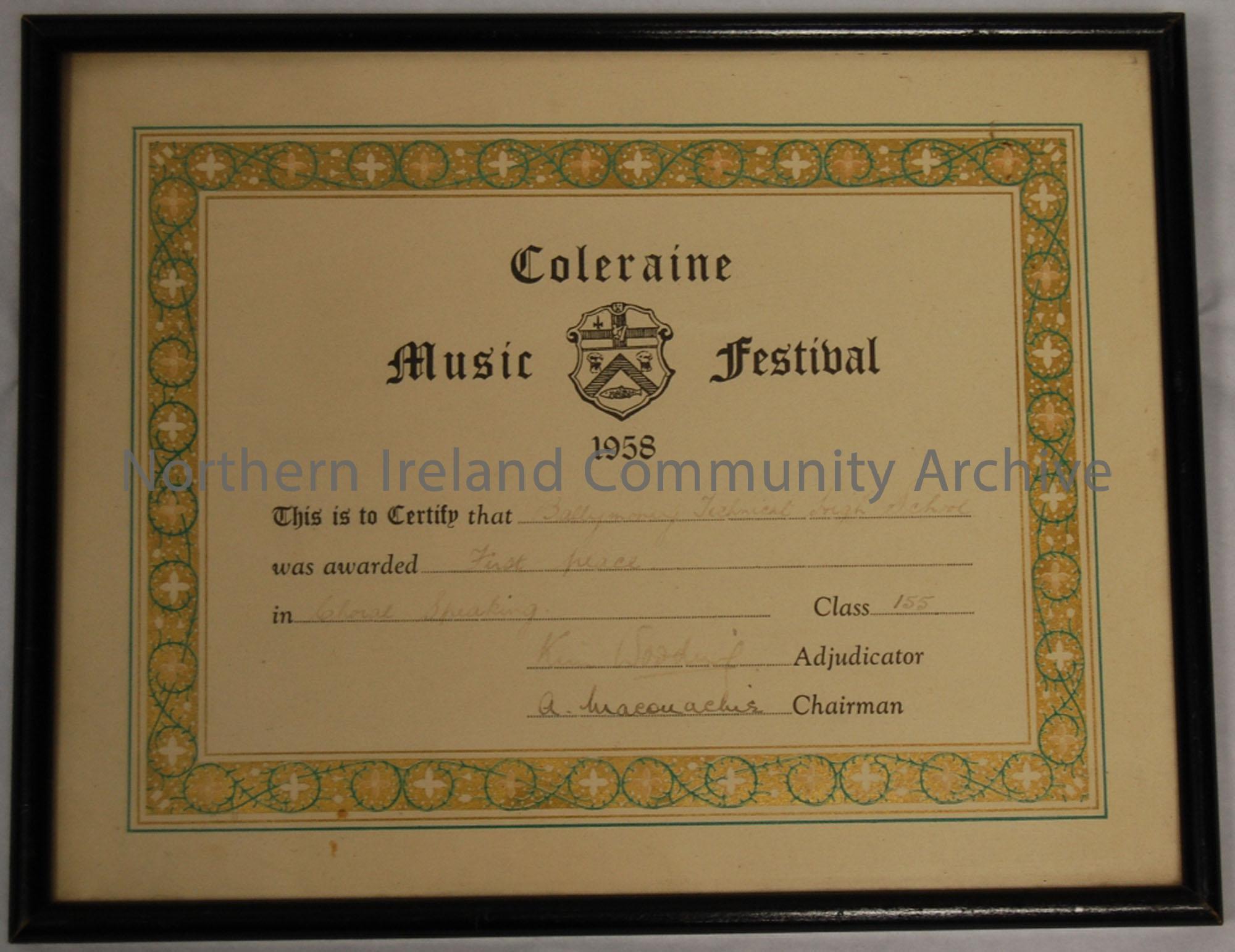 Coleraine Music Festival 1958 certificate. ‘This is to certify that Ballymoney Technical high school was awarded first place in Choral Speaking. class…