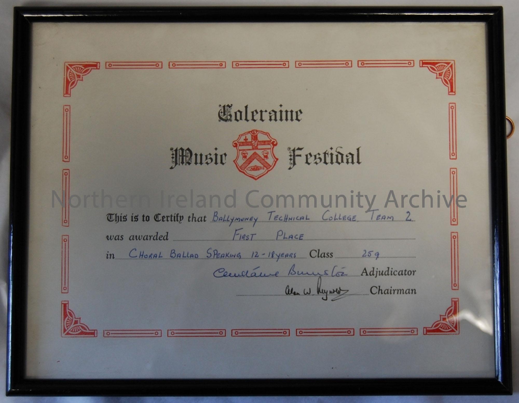 Coleraine Music Festival certificate. 'This is to certify that Technical college Ballymoney, Team 2 was awarded First Place in Choral Ballad Speaking. Class 259 (12-18yrs) In black frame behind glass with wall hooks.