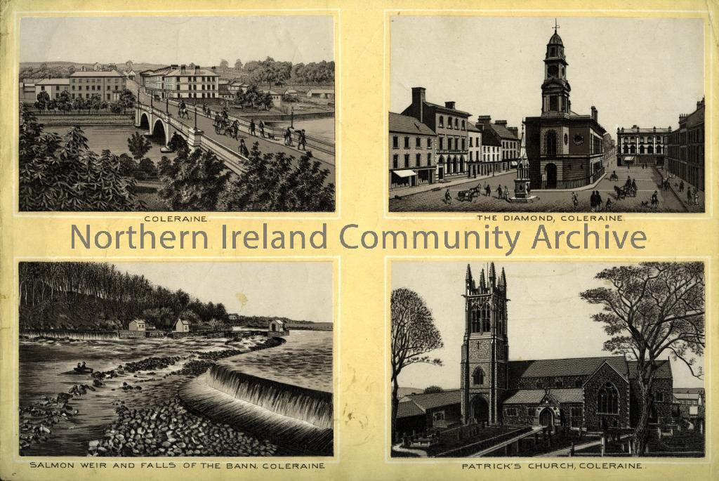 a selection of four prints relating to various areas in Coleraine. 'Coleraine', 'The Diamond, Coleraine', 'Salmon Weir and falls of the Bann, Coleraine', 'Patrick's Church, Coleraine'. All are placed on one sheet and are boarded with white.