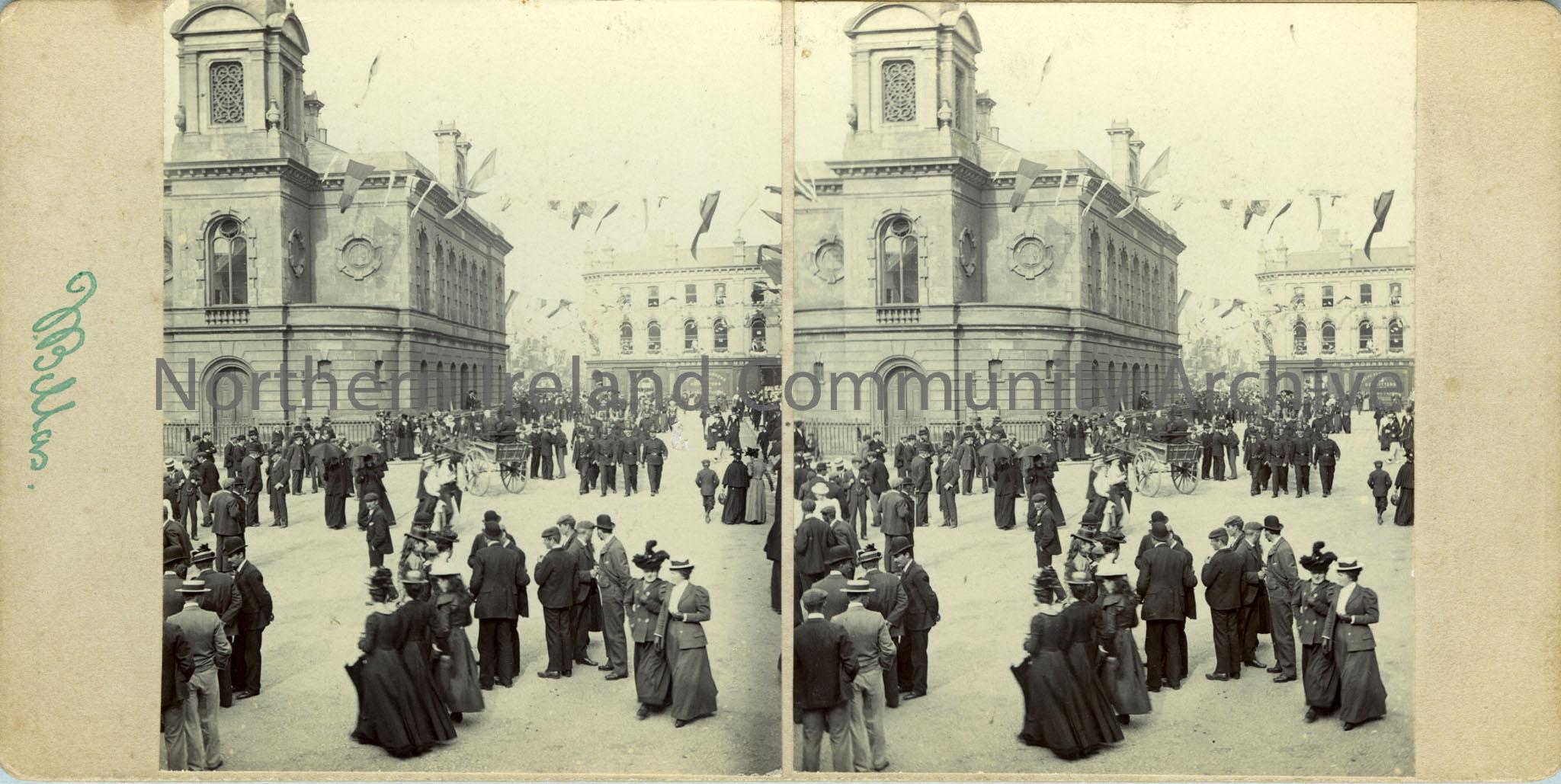 black and white photograph depicting Coleraine Town Hall and The Diamond during Victorian times. Crowd pictured in The Diamond with horse and cart in the background. Women and men wearing hats, bunting has been hung in The Diamond. There are two images on one card but they seem to be moments apart. These images were made to be viewed with a stereo scope.
