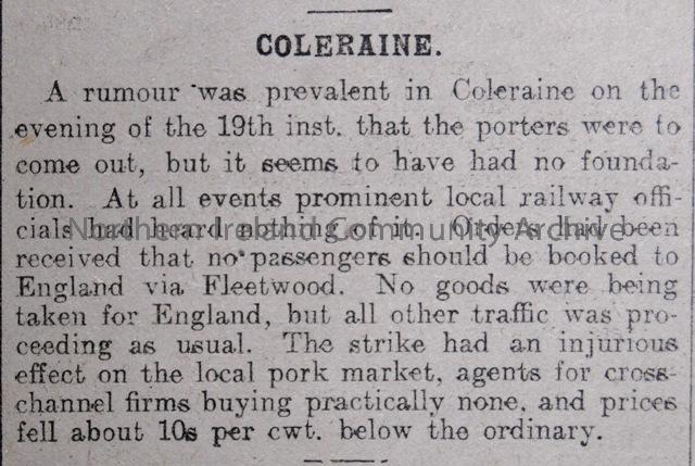 Article printed in the Belfast Newsletter on 21/08/1911 about strike action on the railways in Coleraine.