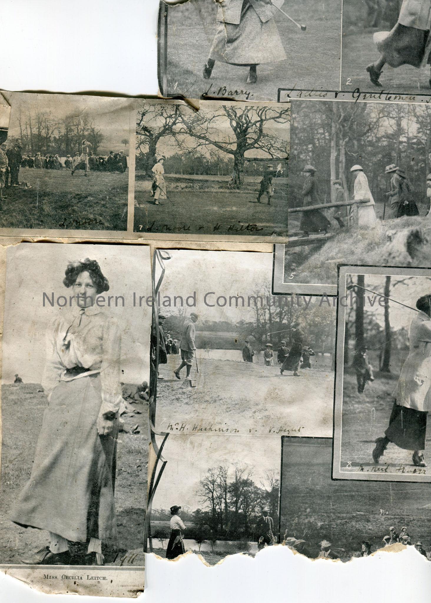 Collage of images cut out from newspaper re golf. 'Ladies v Gentlemen, Stokes Poges 1911'. Images of women playing golf. images captioned in ink, 'L. Barry', 'L. Moore', 'G. P?', 'L. Moore & H. Hilton', '?H. Hutchinson v V. Hezlet', 'Capt Hutchinson v L. Moore'. Other names illegible. Bottom right photograph captioned, 'Miss Cecilia Leitch' and '1911' written in ink on image. 'May Hezlet' written on back of newspaper cutting.