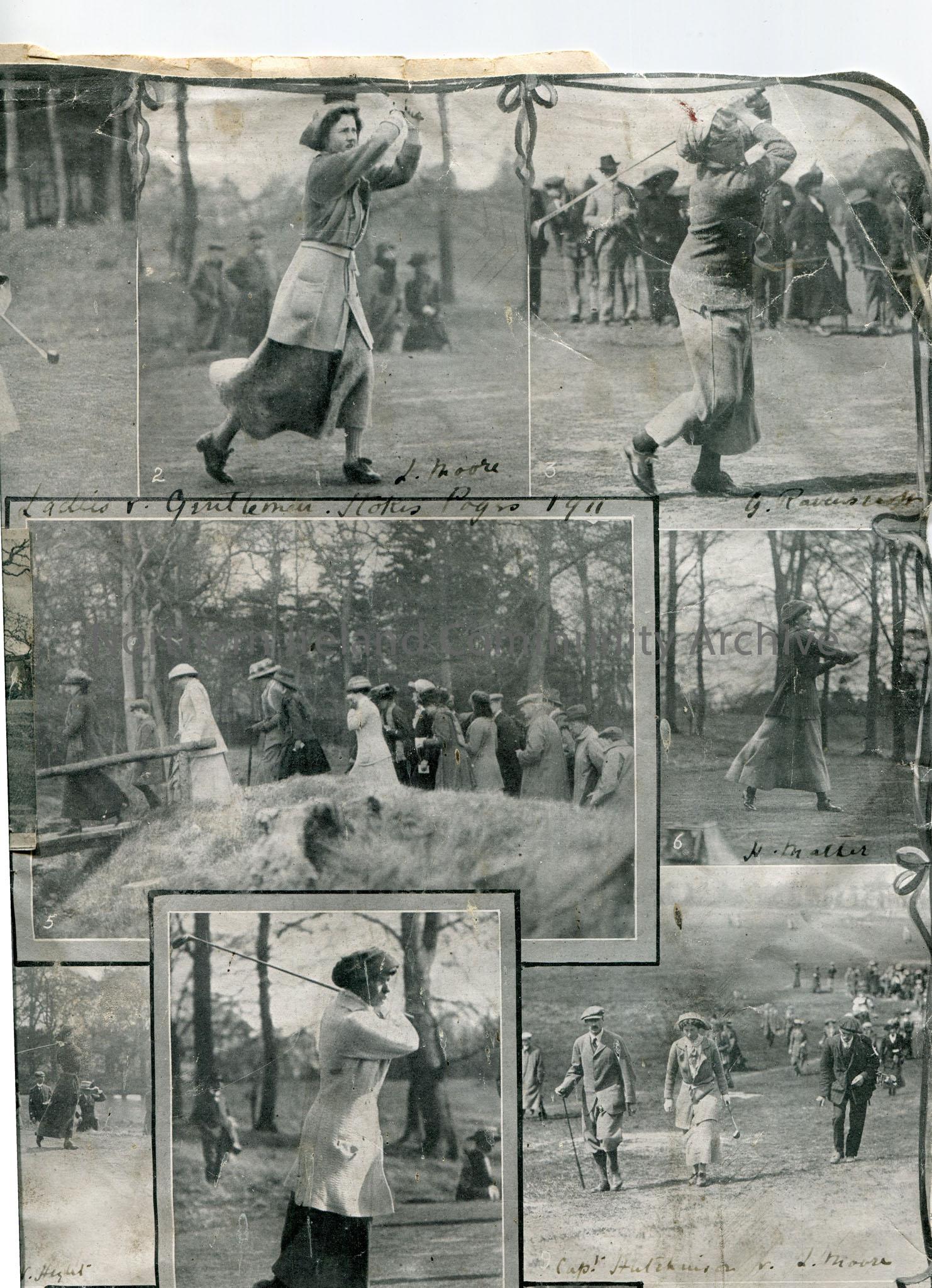 Collage of images cut out from newspaper re golf. ‘Ladies v Gentlemen, Stokes Poges 1911’. Images of women playing golf. images captioned in ink, ‘L. …