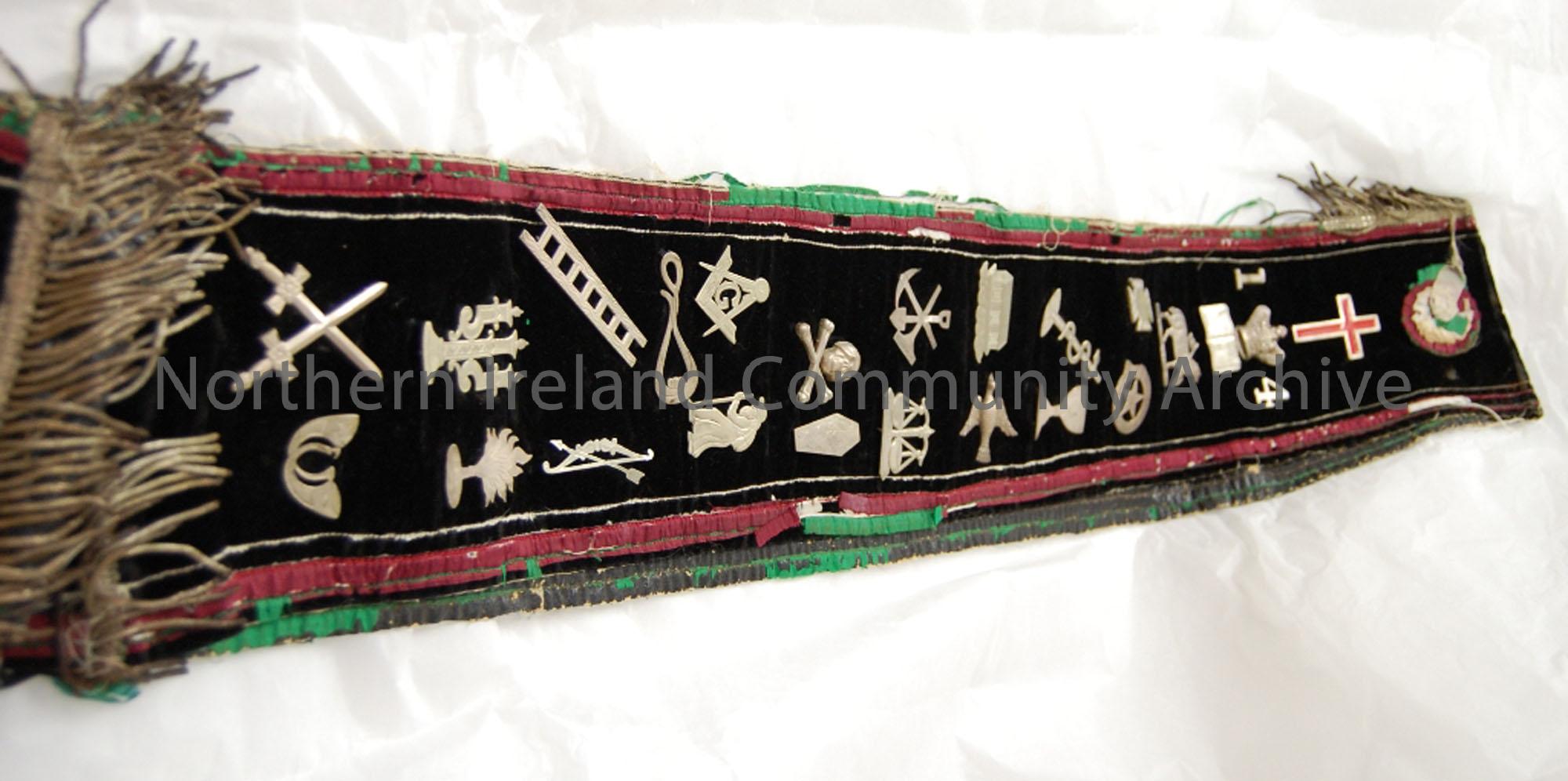 collarette / sash of the Order of the Knights of Malta, with emblems. Belonged to John Atchison, Garryduff. Black felt with purple and green edges