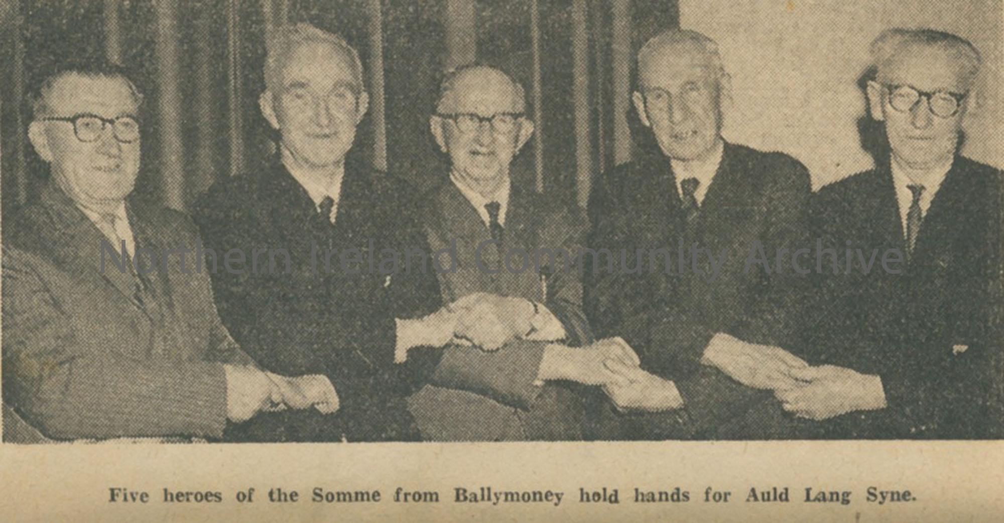 Collection of correspondence relating to the 12th Battalion Royal Irish Rifles Old Comrades Association, ranging in date from 1950 to 1970. Image is a newspaper clipping of five men who fought at the Somme 1916.