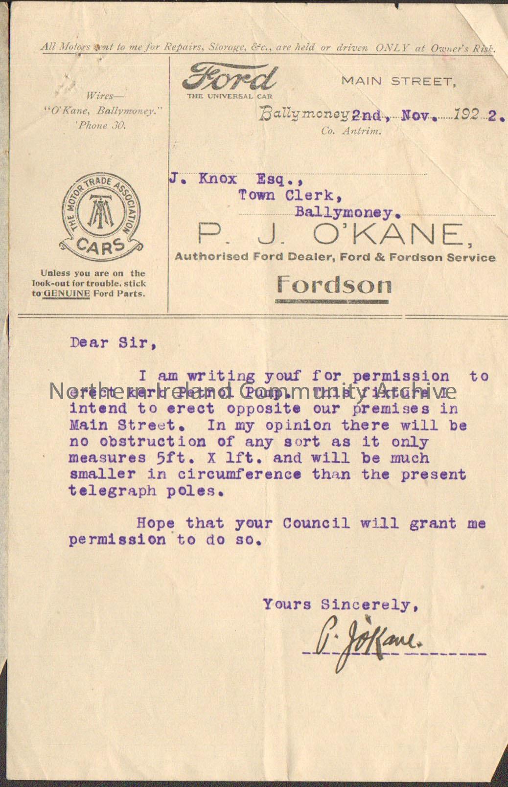 Collection of letters from a variety of shops, garages and car dealerships requesting permission to erect a petrol pump on their premisis – 2014.231 (1)