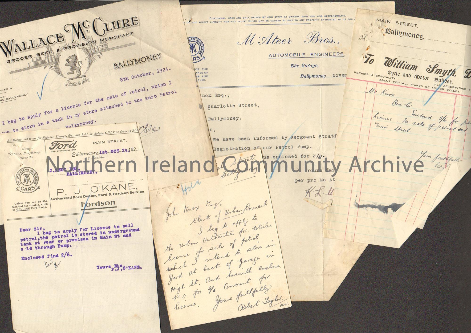Collection of letters from a variety of shops, garages and car dealerships requesting permission to sell petrol on their premises.