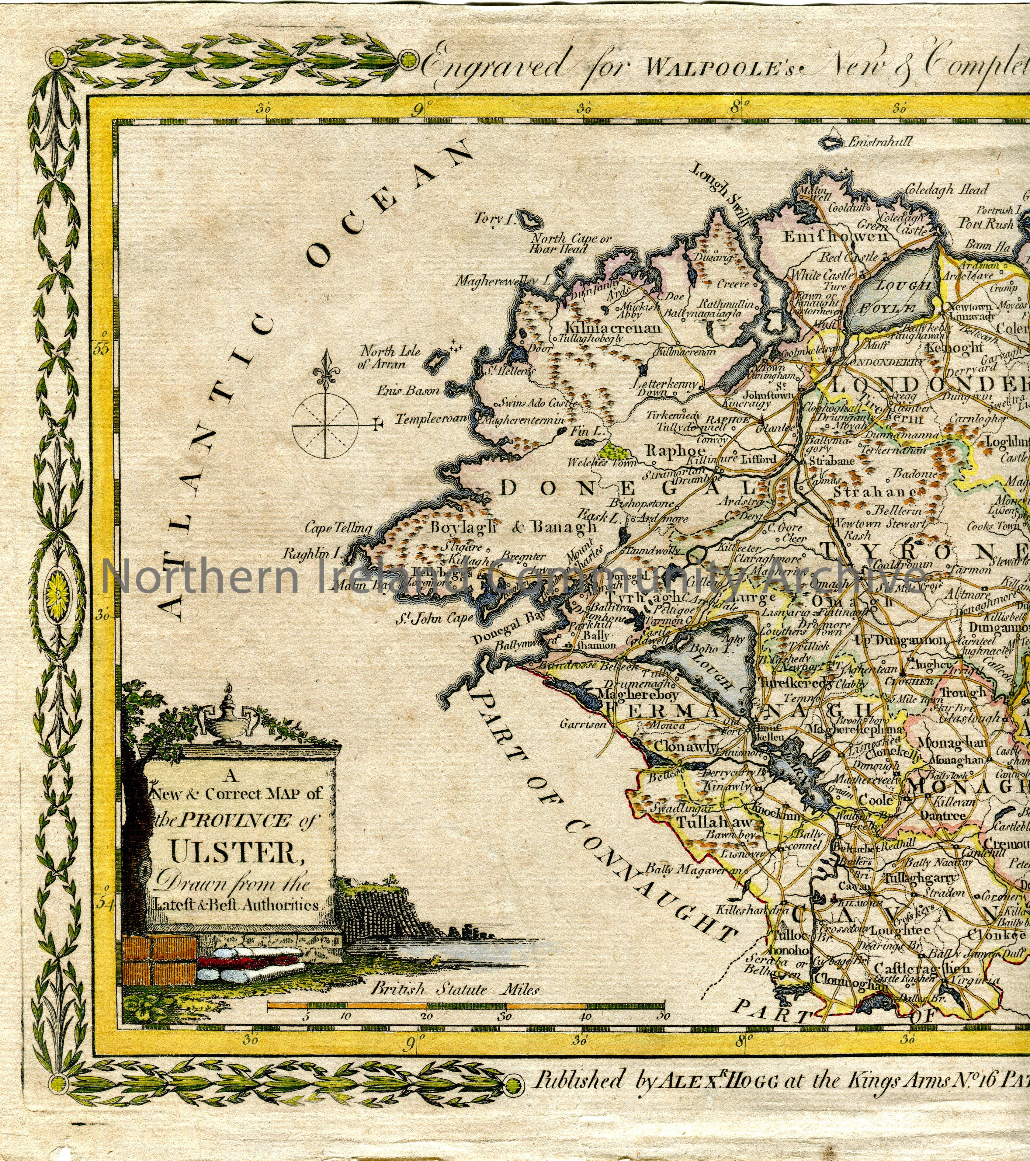 Colour map. 'A New & Correct MAP of the PROVINCE of ULSTER, Drawn from the Latest & Best Authorities'. Published by Alex R. Hogg at the Kings Arms No. 16 Pater Noster Row, London. [1790s]. Floral border surrounds map. Appears below on a vertical flat stone forming part of a decorative cartouche which includes the Giant's Causeway. Includes Cities, Boroughs, Post Towns & Places of Note, Villages, Boundaries of Counties and Boundaries of Baronies. Sea coast shaded in blue, loughs in blue, roads in brown.