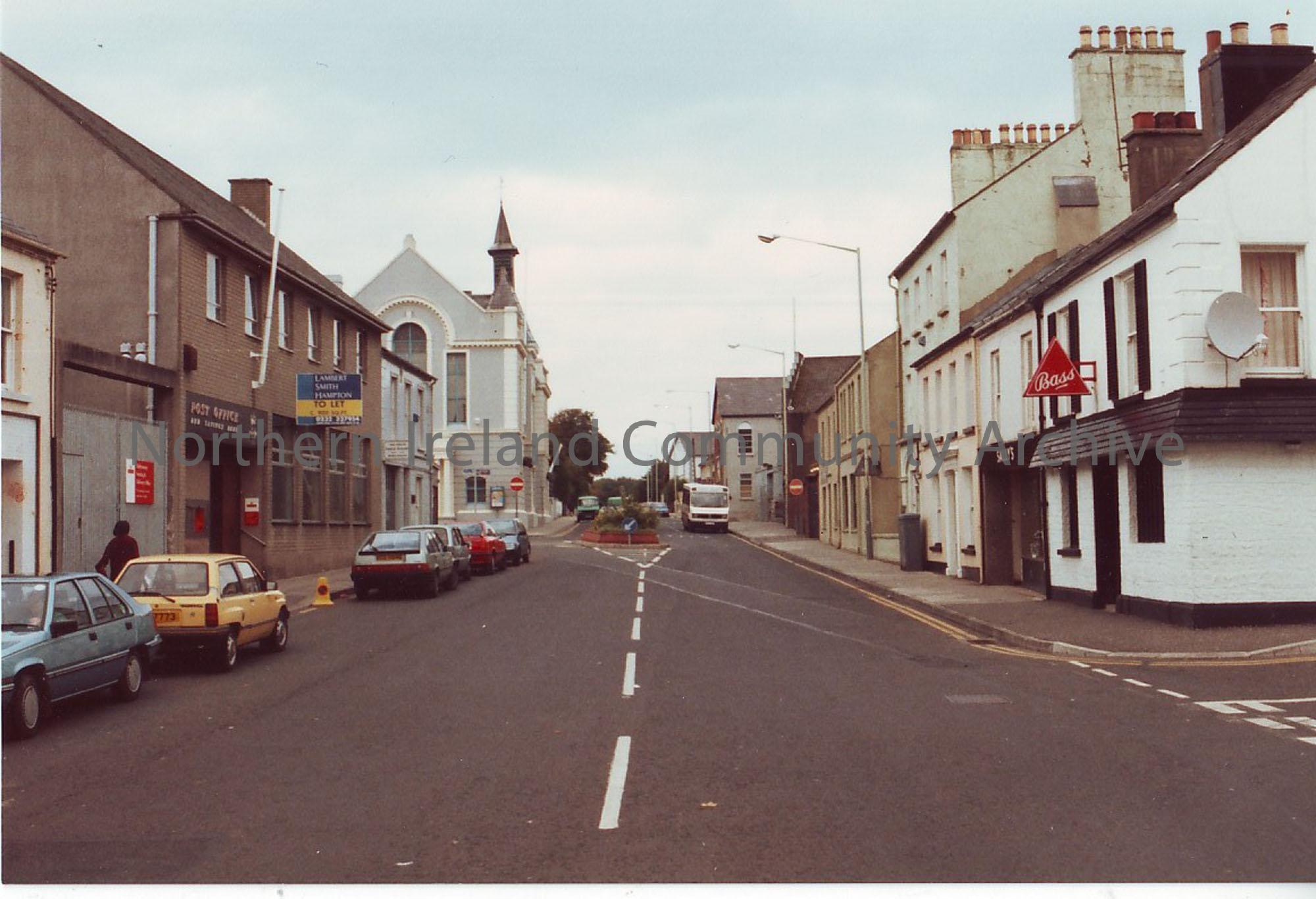 colour photograph, c 1990s. View up High Street. Buildings visible include: Post Office (sorting office), Sally’s The Corner Bar and Town Hall