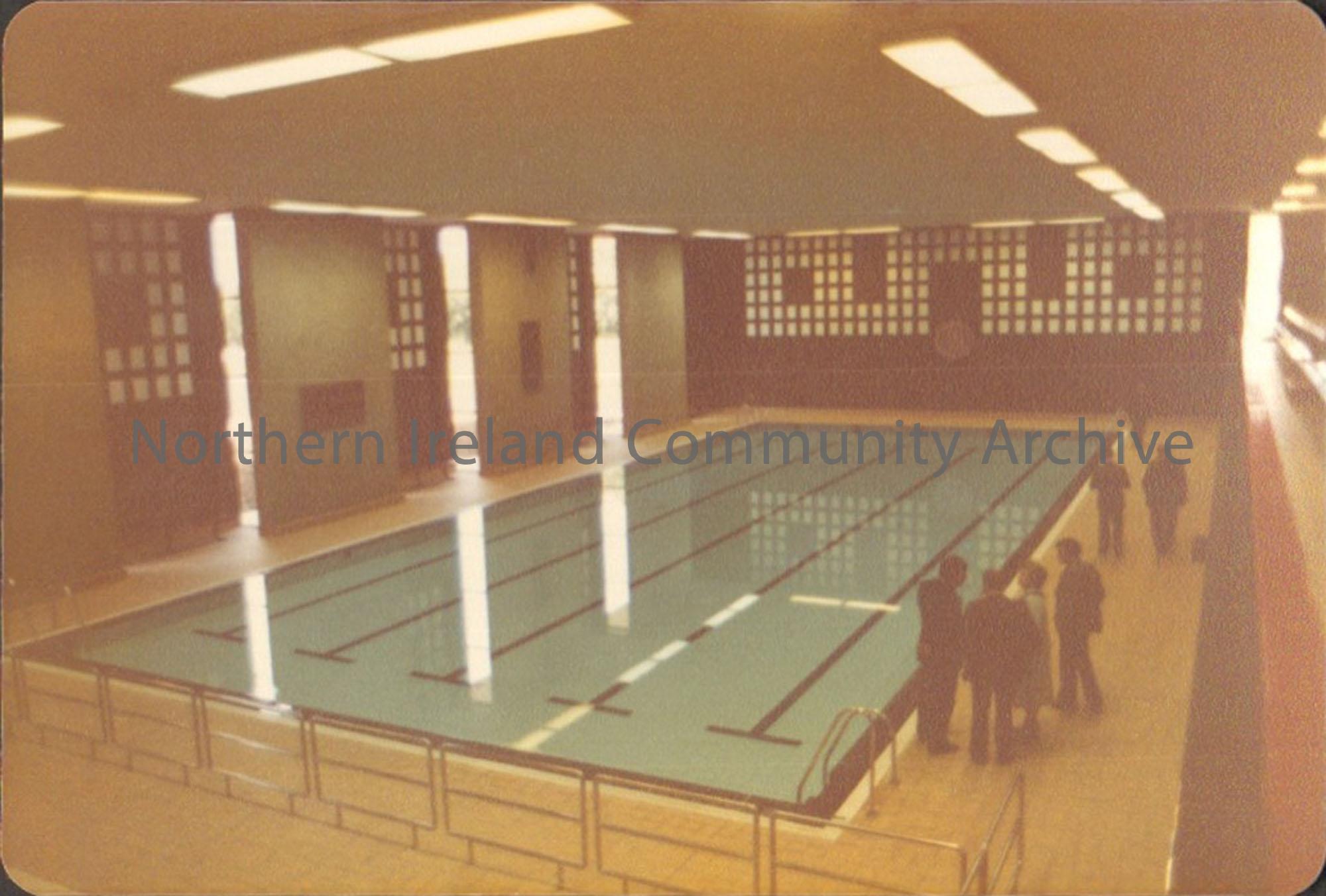Colour photograph of councillors, including Molly Holmes, visiting the swimming pool inside Riada Recreation Centre. Swimming pool with group of people on the right side. Taken from a balcony.