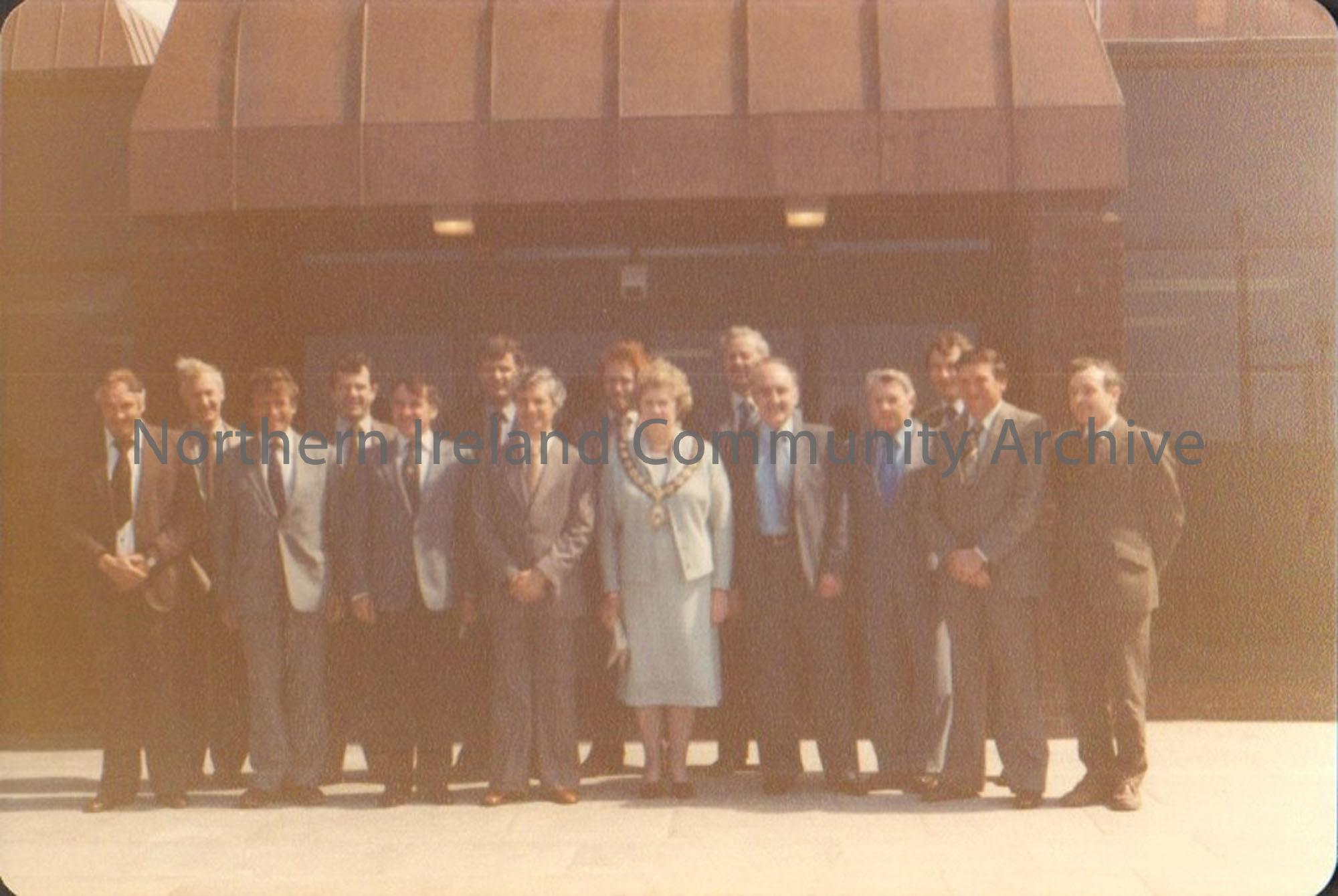 Colour photograph of Molly Holmes with Councillors outside of the front of Riada Recreation Centre. Group of fifteen people in front of a brown building.